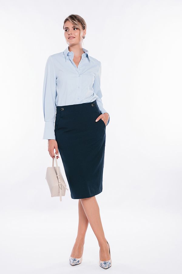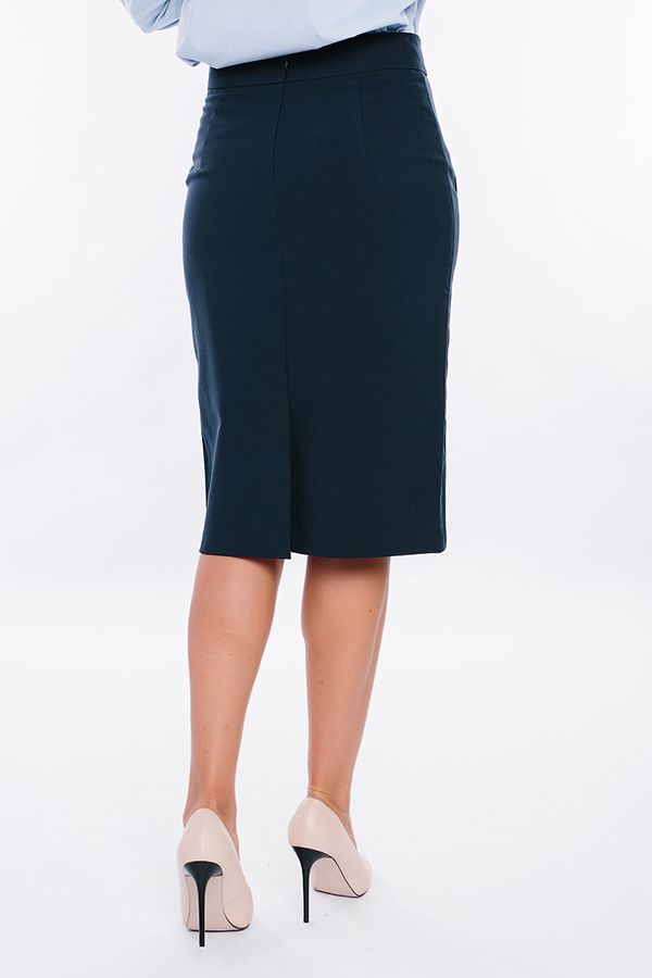 Юбка оригинального кроя на подкладе. Детали: спереди боковые швы смешены на переднюю половинку, боковые карманы с отрезным бочком, сзади шлица, широкий фигурный пояс, в среднем шве потайная молния. Длина изделия: 66 см. Размер модели на фото: 44.  Параметры модели: 86-63-94. Рост модели на фото: 173 см.
