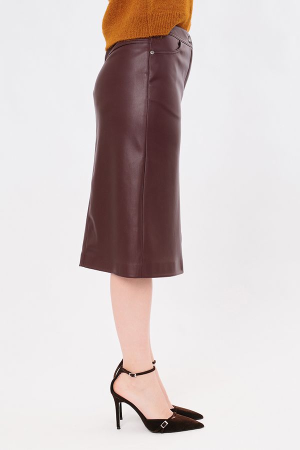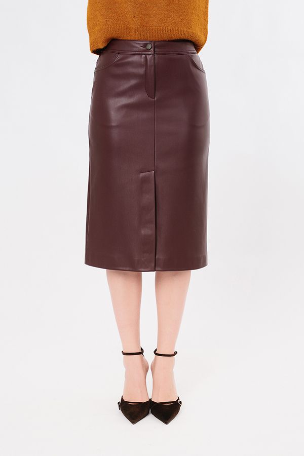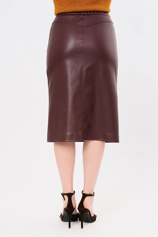 Современная  юбка из бордовой эко-кожи. Детали: Спереди застежка на молнию и пуговицу, карманы с горизонтальным входом, в среднем шве шлица. Сзади кокетка с двойной отстрочкой. В поясе по спинке резина. Длина изделия 68 см. Размер модели на фото: 44.  Параметры модели: 90-64-97. Рост модели на фото: 175 см.