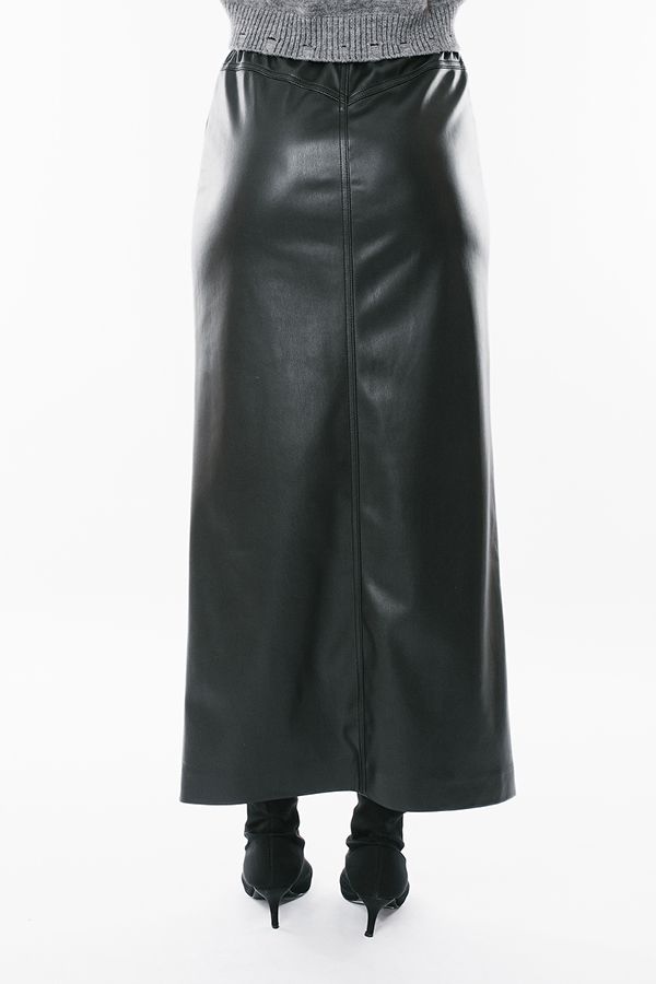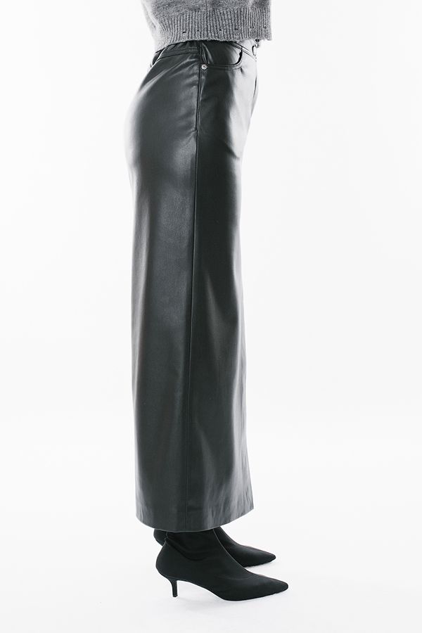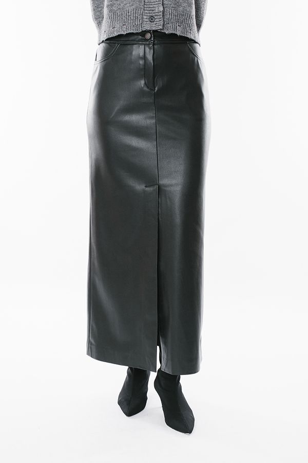 Современная молодежная юбка-миди из черной эко-кожи. Детали: Спереди застежка на молнию и пуговицу, карманы с горизонтальным входом, в среднем шве шлица. Сзади кокетка с двойной отстрочкой. В поясе по спинке резина. Длина изделия 97 см. Размер модели на фото: 44.  Параметры модели: 86-63-94. Рост модели на фото: 173 см.