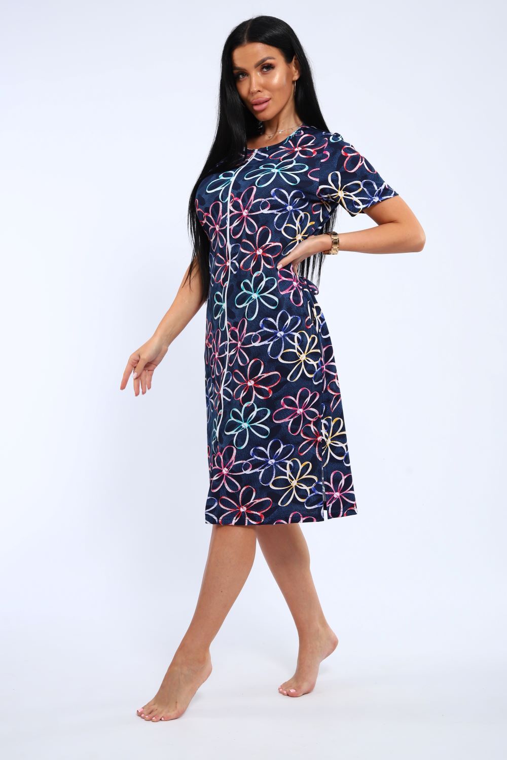ХАЛАТ домашний - безупречное изделие, которое сочетает в себе комфорт, аккуратный внешний вид и простоту в уходе. Модель разработана с учётом повседневных потребностей современных женщин: удобно носить дома, на даче, в поездках или во время отдыха. Свободный крой и мягкий материал позволяют чувствовать себя комфортно в течение всего дня, не стесняя движений и не перегружая образ. Халат на молнии, 2 боковых кармана, круглый воротник, завязки на спине. Цвет: ромашка;леопард;Жираф; Материал: кулирка; Состав: Хлопок 100 %.