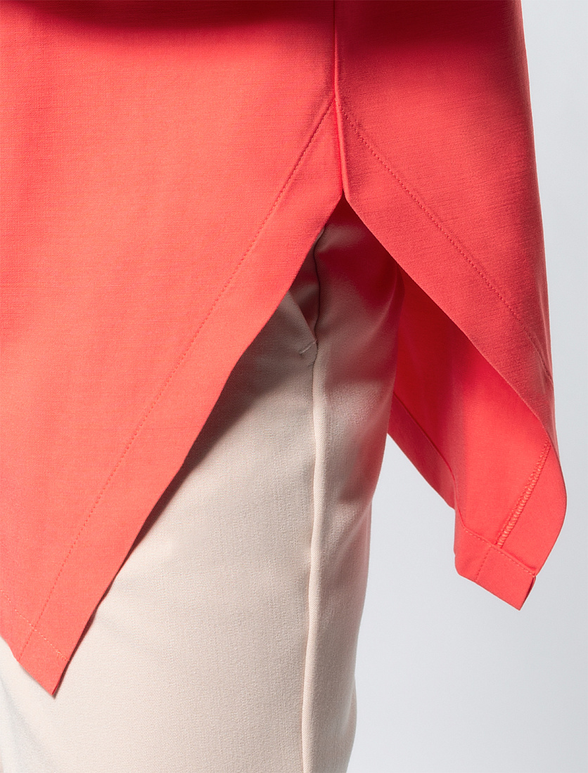 Ассиметричный топ с цельнокроеным рукавом выполнен из плотного лиоцелла. Добавление синтетических волокон в составе изделия предотвращает сминаемость. Модель золотистым логотипом бренда. Подходит для любой фигуры. Для создания расслабленного образа, сочетайте в костюме с брюками D24.214, D24.218, шортами D28.054 и юбкой D26.181