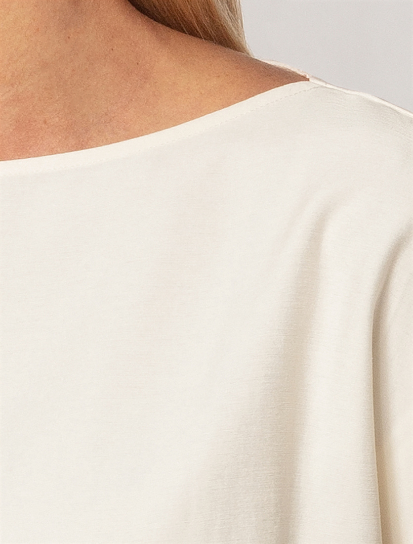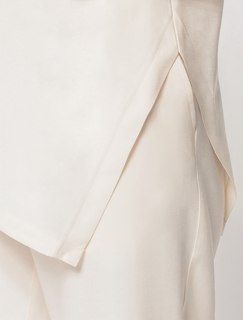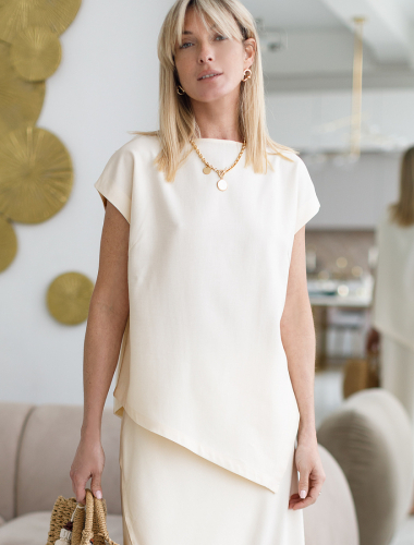 Ассиметричный топ с цельнокроеным рукавом выполнен из плотного лиоцелла. Добавление синтетических волокон в составе изделия предотвращает сминаемость. Модель золотистым логотипом бренда. Подходит для любой фигуры. Для создания расслабленного образа, сочетайте в костюме с брюками D24.214, D24.218, шортами D28.054 и юбкой D26.181