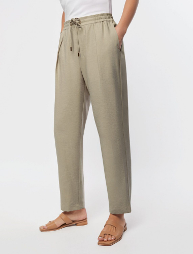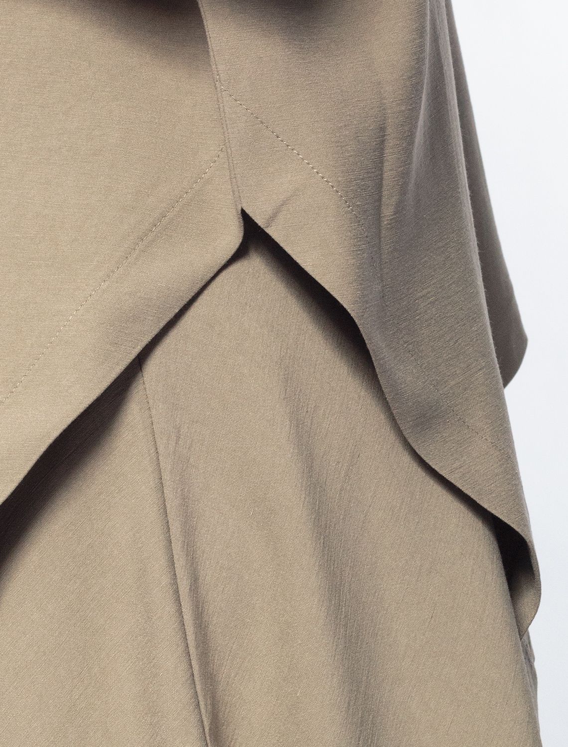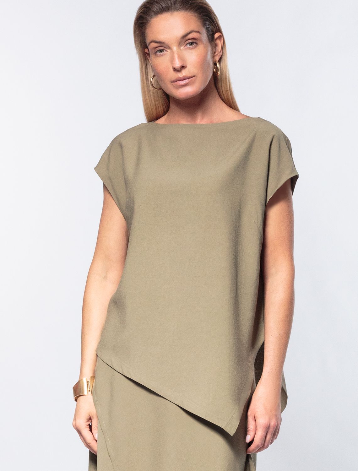 Ассиметричный топ с цельнокроеным рукавом выполнен из плотного лиоцелла. Добавление синтетических волокон в составе изделия предотвращает сминаемость. Модель золотистым логотипом бренда. Подходит для любой фигуры. Для создания расслабленного образа, сочетайте в костюме с брюками D24.214, D24.218, шортами D28.054 и юбкой D26.181