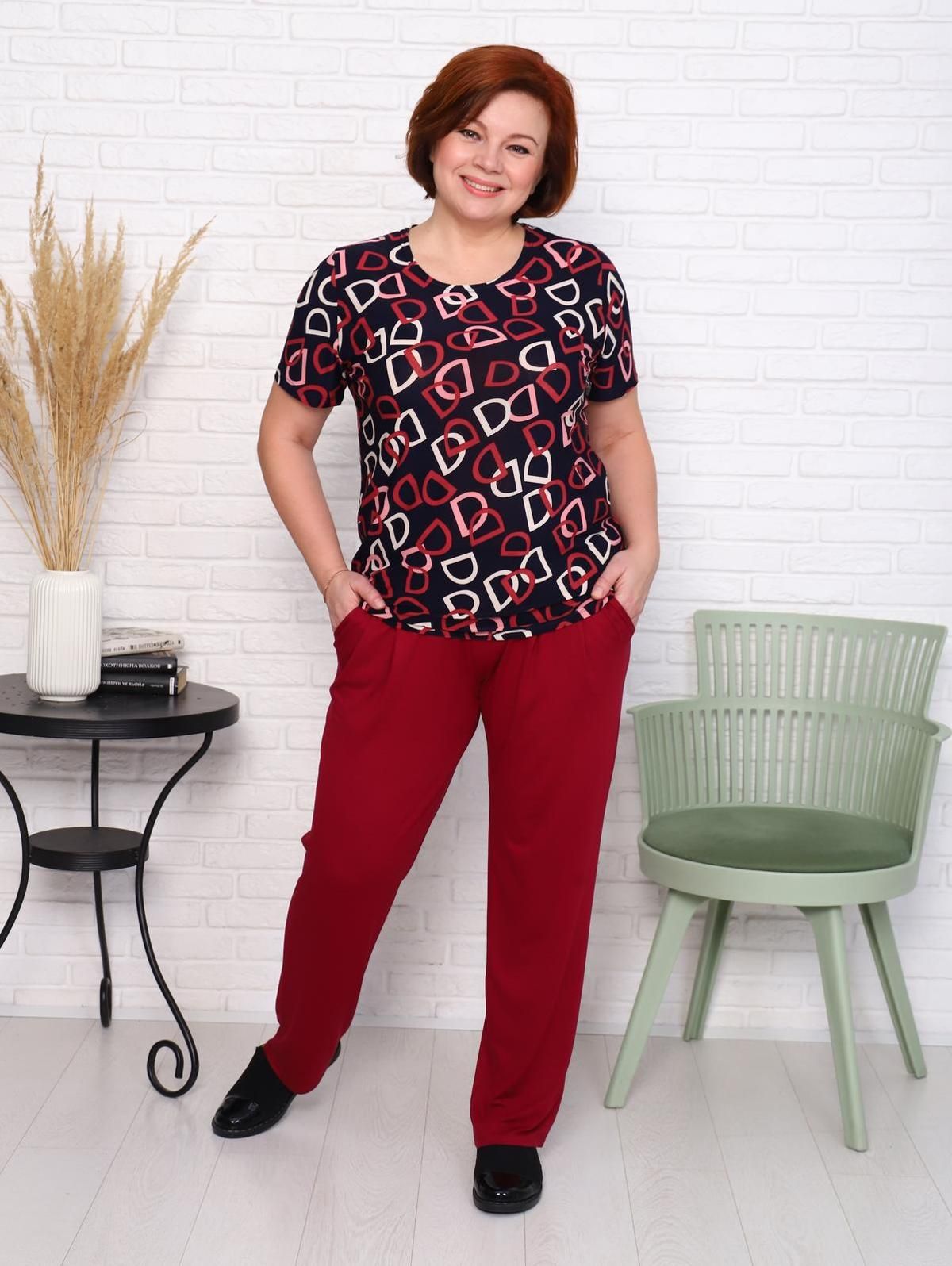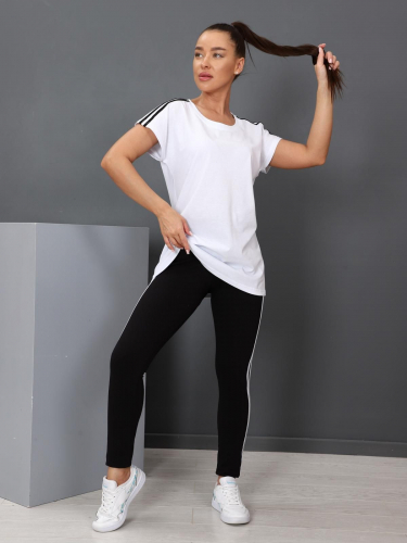 Удобный и стильный костюм: футболка с брюками. Футболка выполнена из легкого и приятного материала масло. Брюки выполнены из вискозы. Брюки прямого покроя, на эластичном поясе, с карманами в боковых швах. Костюм прекрасно подойдет на любую фигуру. В нем Вы будете чувствовать себя легко и свободно.