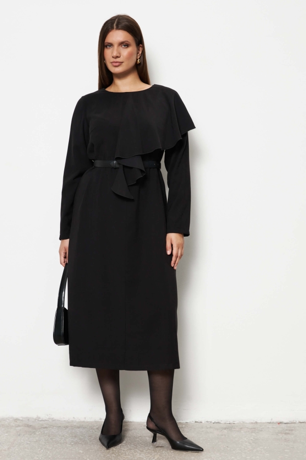 Платье свободного трапециевидного силуэта с ассиметричным воланом. Рукав втачной. Застежка по спинке в виде разреза, на пуговице.