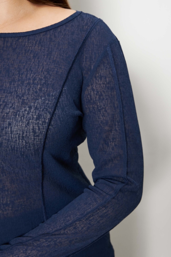 Лонгслив из полупрозрачного трикотажа с необычной фактурой. Модель приталенного силуэта, с рельефными швами "наружу.