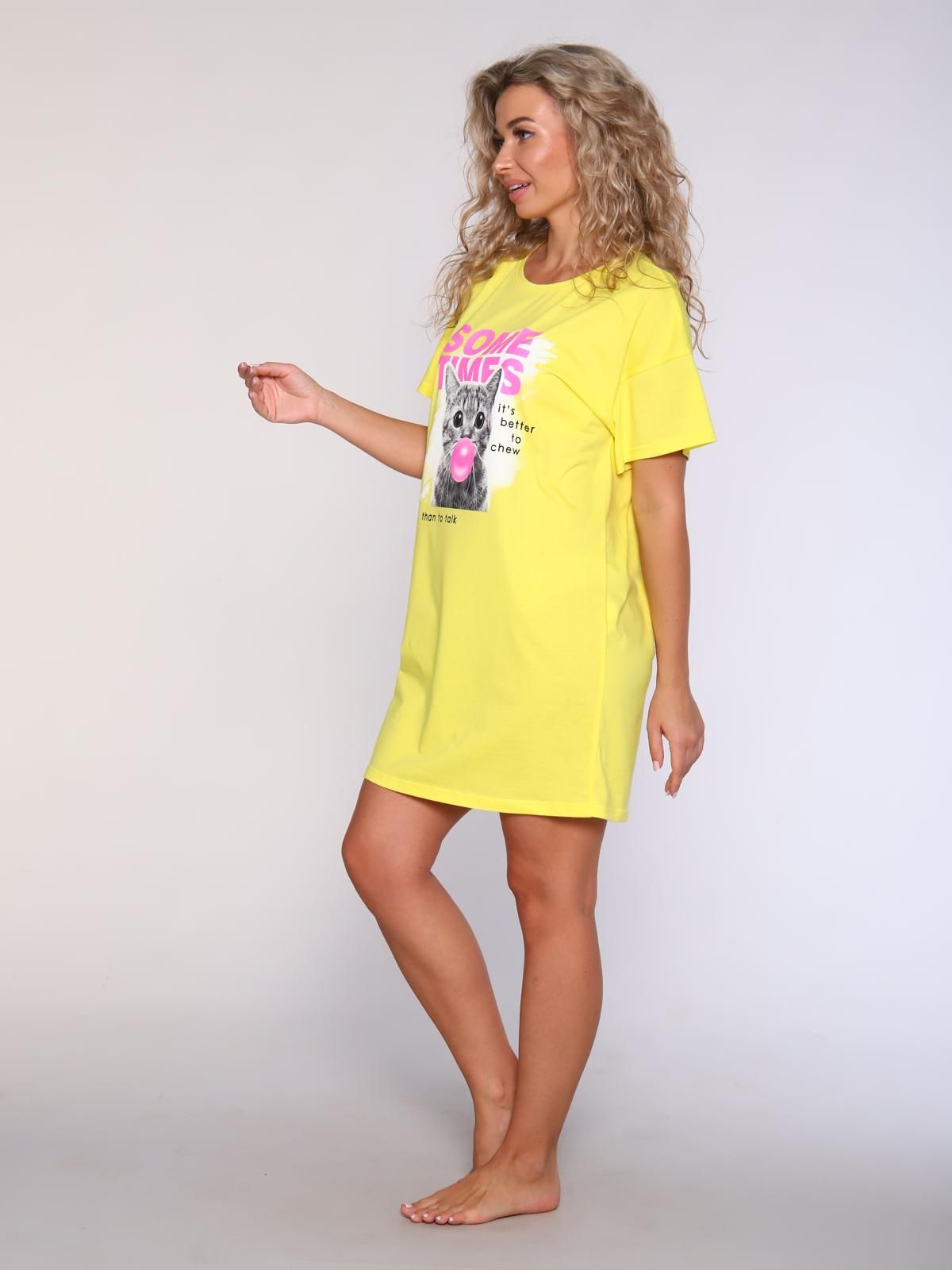 Туника "Бабл-Гам" свободного кроя, со спущенным плечом и коротким рукавом, выполнена из однотонного трикотажного полотна "кулирка" и украшена ярким принтом. Вырез горловины овальной формы обработан обтачкой из основной ткани.