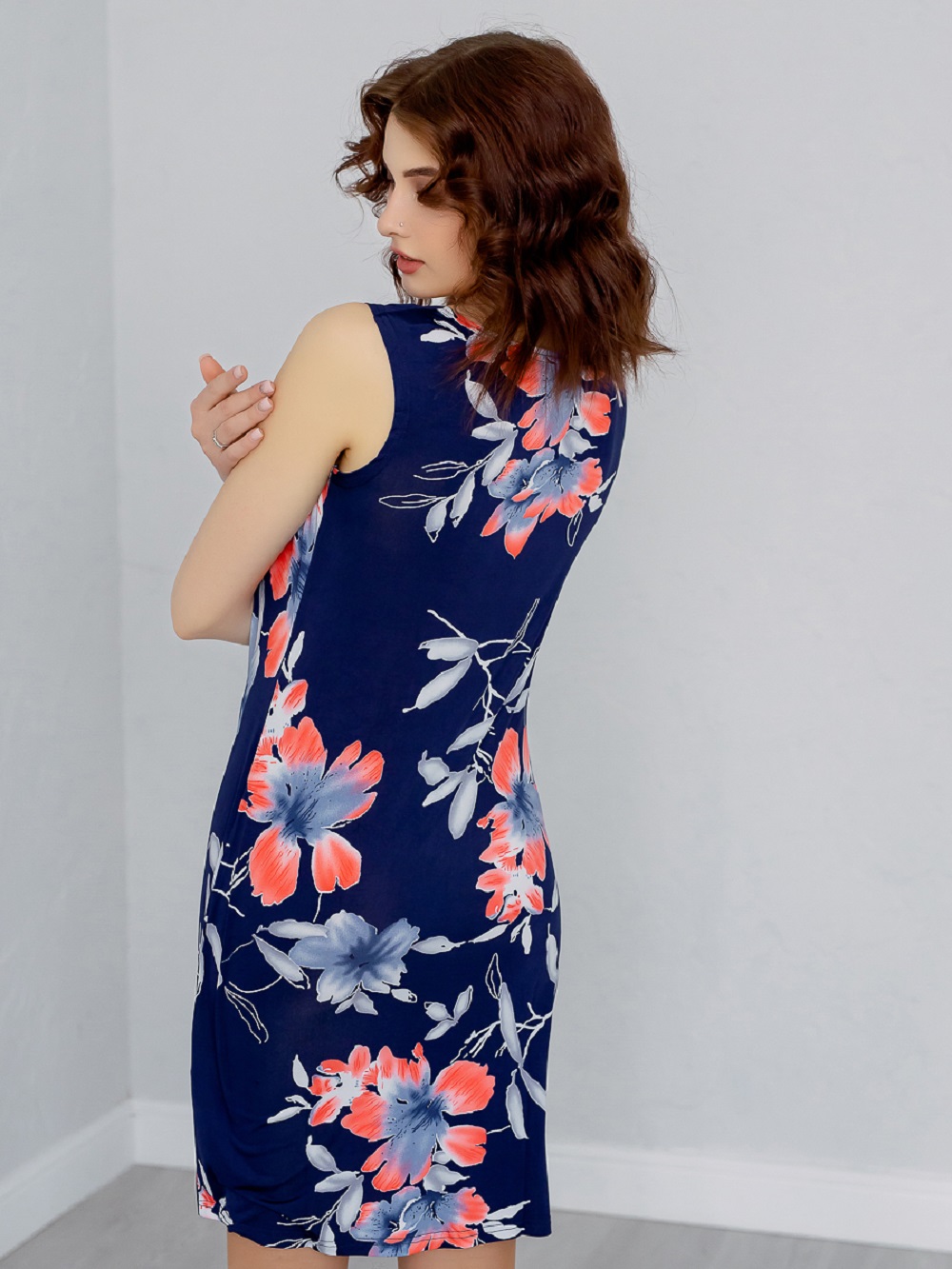 Платье прямого силуэта, длиной чуть ниже линии колена. По переду, в области груди ассиметричная драпировка, которая собрана на металлическое кольцо - подкову. Цвет: цветной; Материал: масло;масло; Состав: 95% ПЭ, 5% эластан.