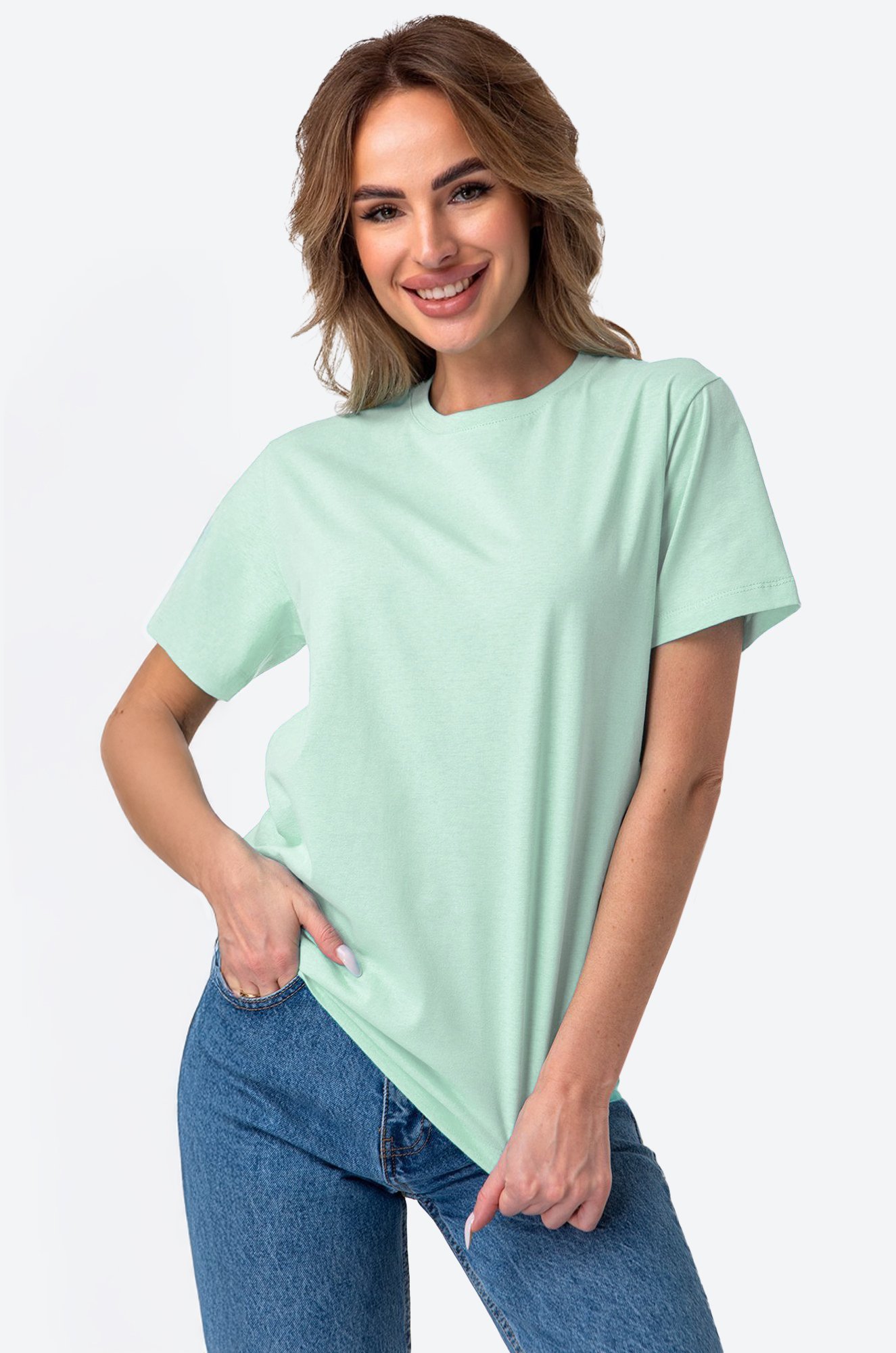 — футболка ментолового цвета универсальна и легко сочетается с любыми элементами гардероба;