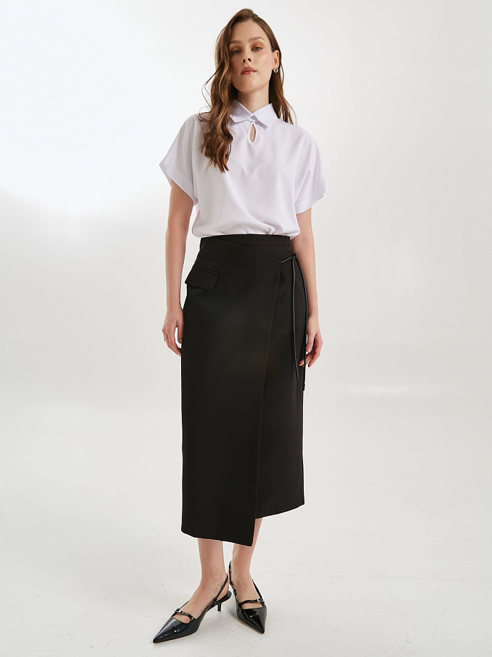 Модель прямого силуэта. Спереди окантованный вырез и застёжка на пуговицу на стойке. Воротник сорочечный. В боковых швах небольшие разрезы.