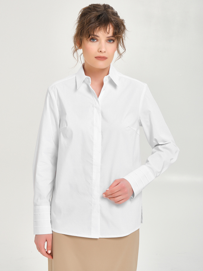 Спереди потайная застёжка на петли и пуговицы. Спинка с кокеткой, переходящей на перед. Сзади под кокеткой защипы. В боковых швах разрезы. По низу рукава защипы и широкая манжета. На манжете обработана группа застроченных складок и застёжка на пуговицы.