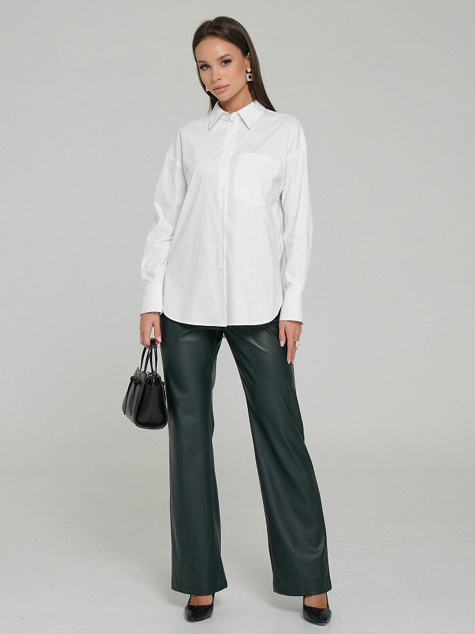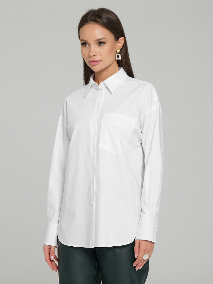 Спинка с кокеткой, под кокеткой складка. Спереди накладной карман. По низу рукава защипы, планка и манжета с застёжкой на пуговицы. В боковых швах разрезы. Низ блузы закруглён.
