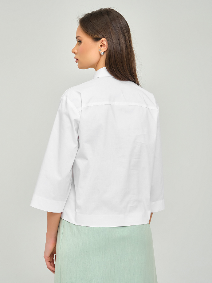 Модель прямого силуэта, со спущенным плечом и кокетками спереди и сзади. Перед ассиметричный, слева в рельефе обработана шлица. Застёжка центральная на петли и пуговицы. Воротник сорочечный. Рукав 3/4.