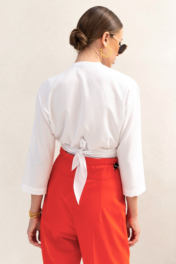 Блуза свободного силуэта из блузочной ткани. На детали полочки цельнокроеные длинные завязки. Вырез глубокий, V-образный. Втачной рукав в спущенную пройму. Длина блузки до линии талии.