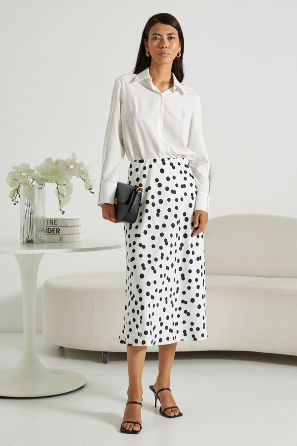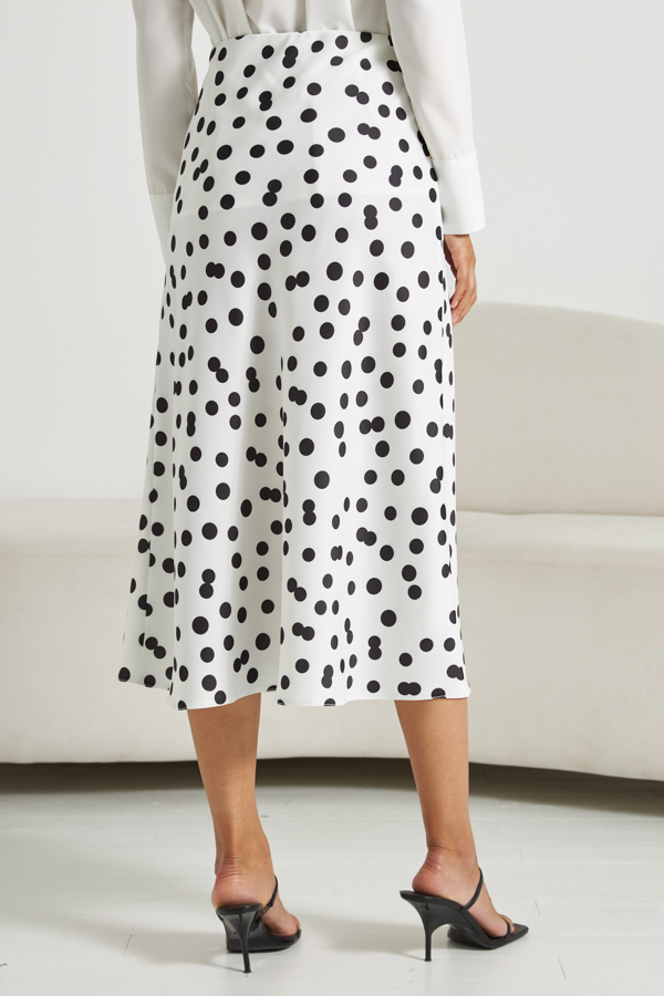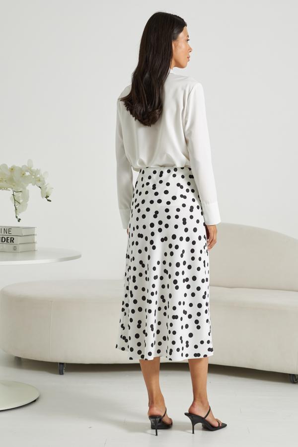 Юбка, слегка расширенная книзу из атласной ткани. Крой юбки по косой, на линии талии скрытая резинка.