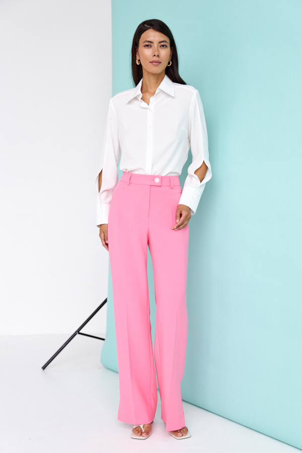 Блуза-рубашка из блузочной ткани. Свободный силуэт с застёжкой на пуговицы. Вырез горловины обработан отложным воротником на стойке. Оригинальный втачной рукав на манжете с застёжкой на пуговицы.