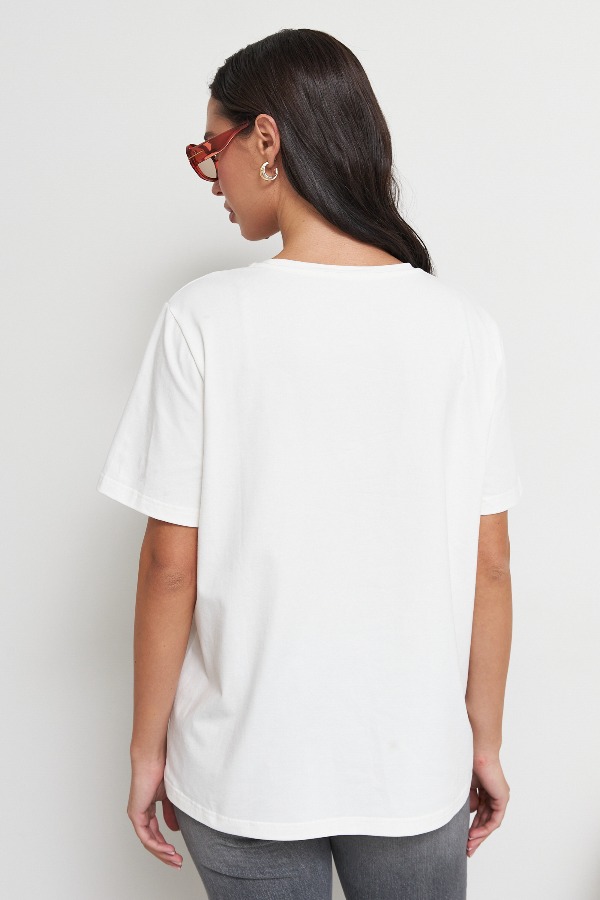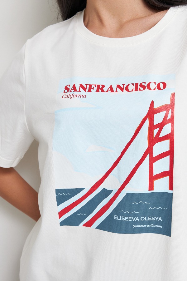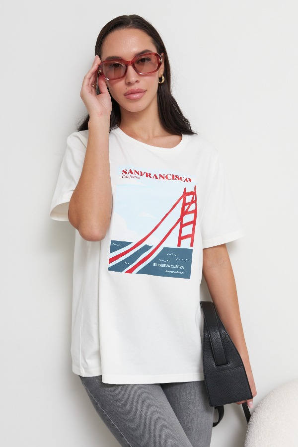 Джемпер свободного силуэта из хлопкового эластичного полотна. Втачной короткий рукав. Круглый вырез горловины оформлен бейкой. На передней части изделия нанесён принт методом шелкографии.