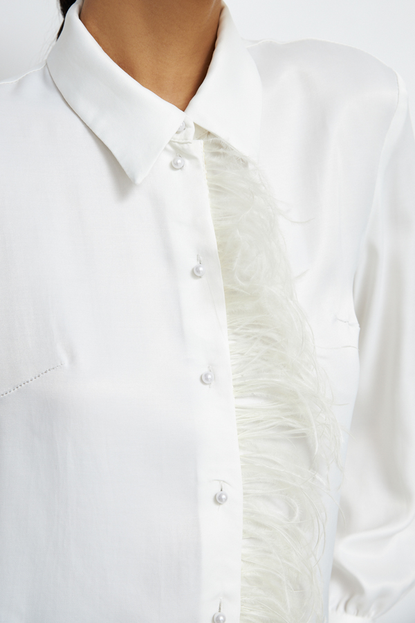 Блуза из вискозной ткани с сатиновым блеском. Свободный силуэт с разрезами в боковых швах и застёжкой на пуговицы. На задней части изделия выполнена кокетка с небольшой складкой. Вырез горловины обработан отложным воротником на стойке. Втачной рукав на манжете с застёжкой на пуговицы. Изделие украшено съемной планкой с перьями. Перед стиркой планку с перьями необходимо снять.