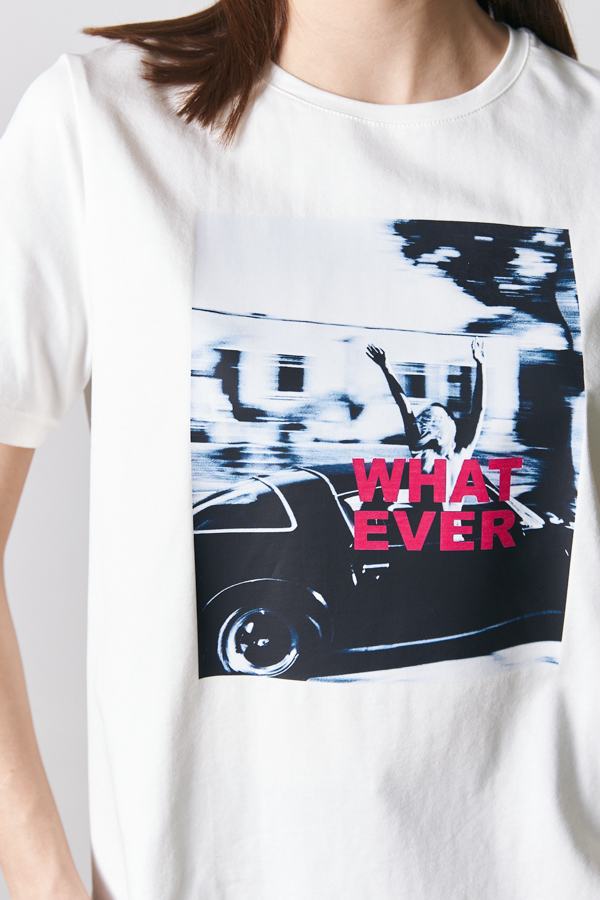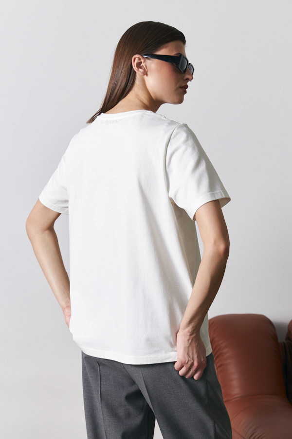 Джемпер свободного силуэта из хлопкового эластичного полотна. Втачной короткий рукав. Круглый вырез горловины оформлен бейкой. На передней части изделия нанесён принт методом шелкографии.