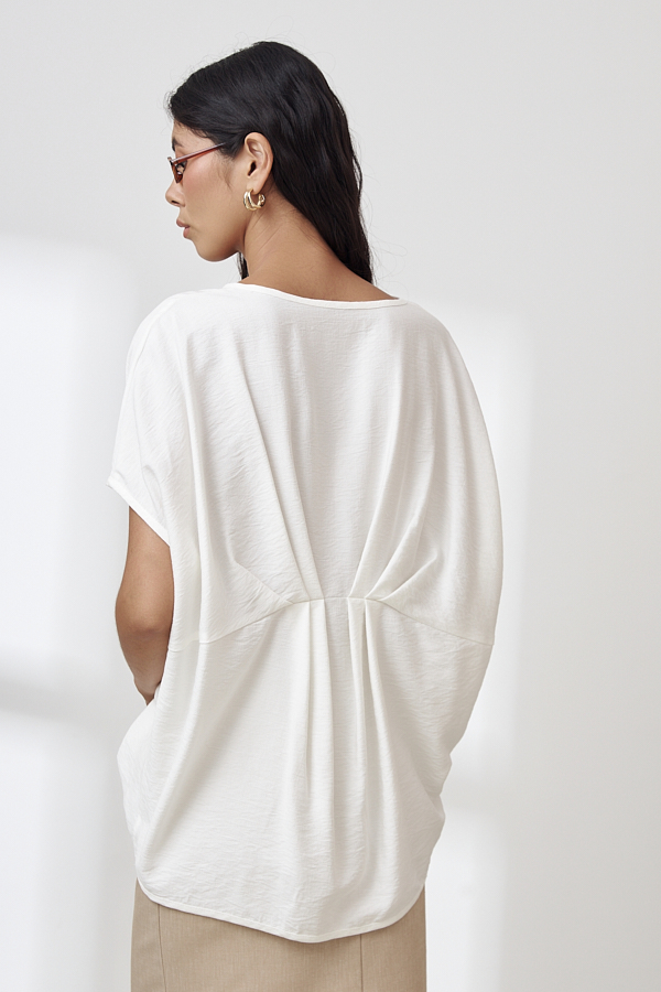 Блуза из вискозной ткани с крэш-эффектом. Свободный крой асимметричной длины (спинка удлинена относительно переда). Спущенное плечо. Линия проймы, линия горловина и низ изделия окантованы косой бейкой из основной ткани. Изюминкой являются оригинальные складки на передней и задней части изделия.