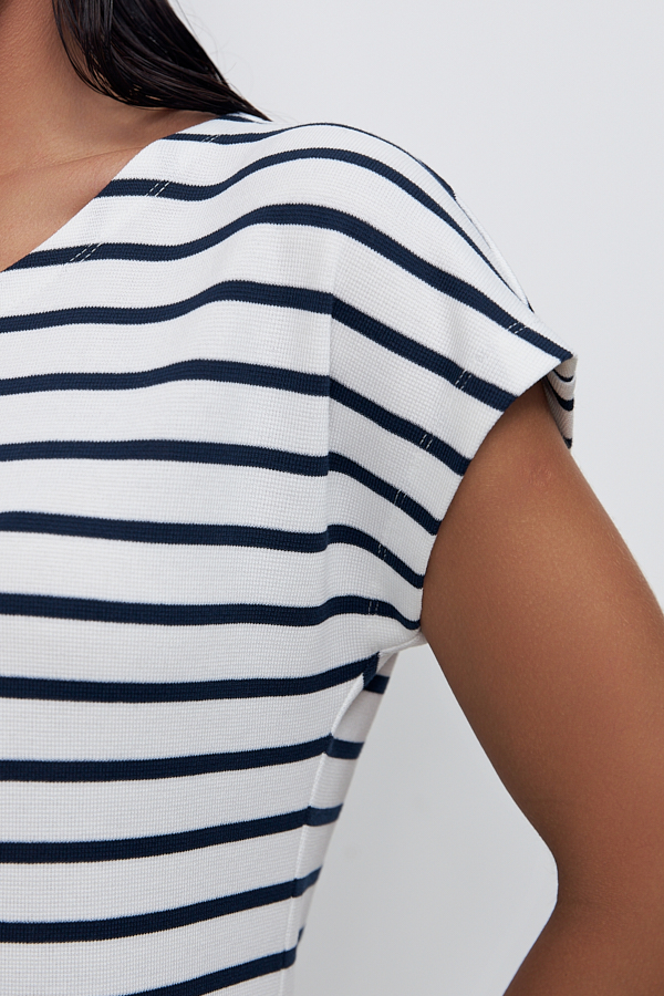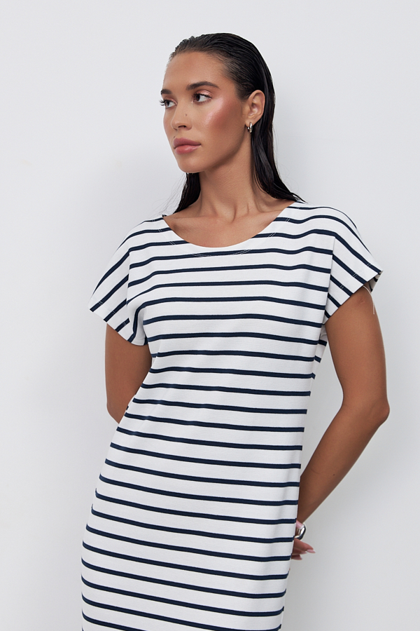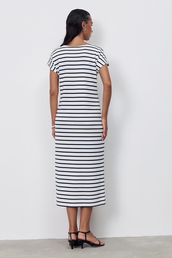 Платье из эластичного полотна. Полуприлегающий силуэт с разрезом в боковом шве. Круглый вырез горловины, цельнокроеный короткий рукав.