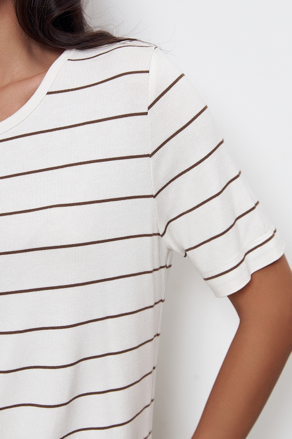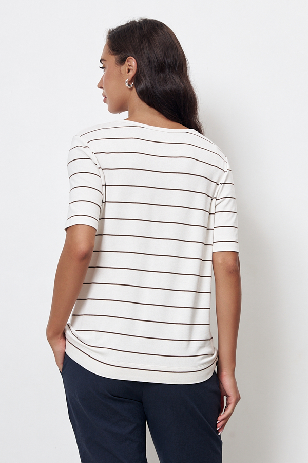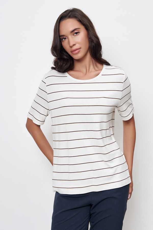 Джемпер из эластичного полотна полуприлегающего силуэта. Втачной короткий рукав. Вырез горловины окантован эластичной бейкой. Джемпер – это хорошая базовая вещь, подходящая для любого гардероба.