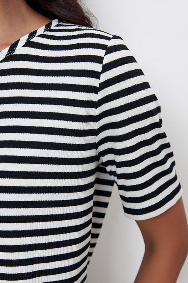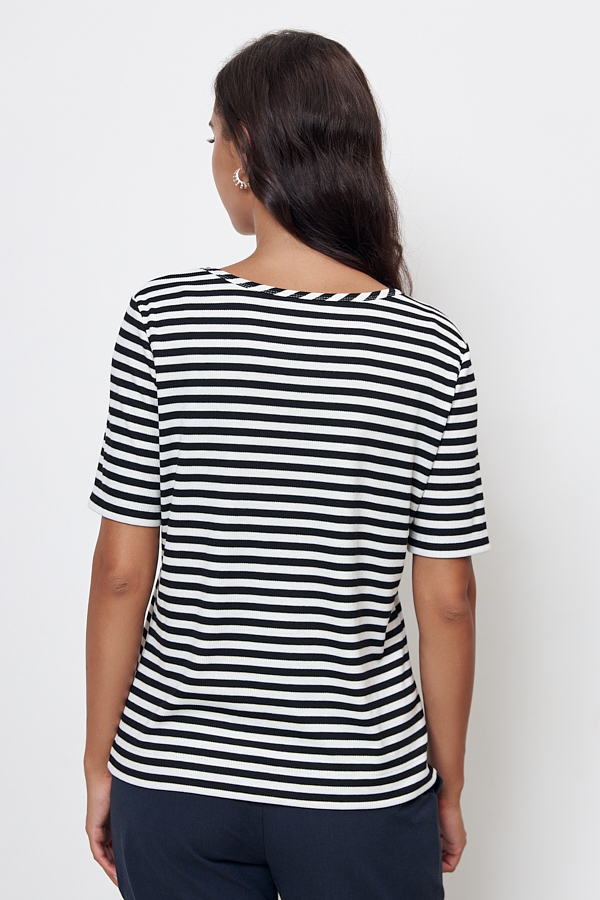 Джемпер из эластичного полотна полуприлегающего силуэта. Втачной короткий рукав. Вырез горловины окантован эластичной бейкой. Джемпер – это хорошая базовая вещь, подходящая для любого гардероба.