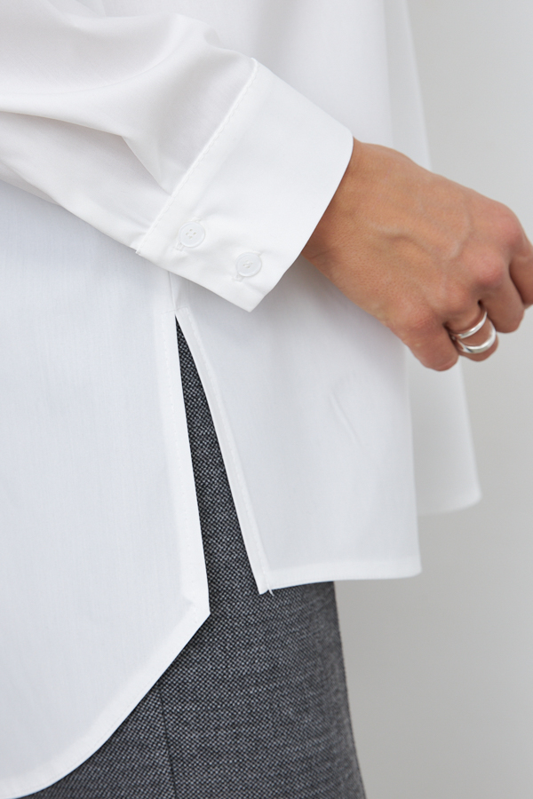 Рубашка свободного силуэта из вискозной ткани с застёжкой на пуговицы. Низ изделия асимметричной длины (спинка удлинена относительно переда) с закруглениями по бокам и разрезами. Рубашечный рукав на манжете с застёжкой на пуговицы. Вырез горловины обработан отложным воротником на стойке. На задней части изделия выполнена кокетка с небольшой складкой. Достоинство этой модели в способности скрыть некоторые недостатки фигуры. Её можно сочетать как с брюками, так и с джинсами.