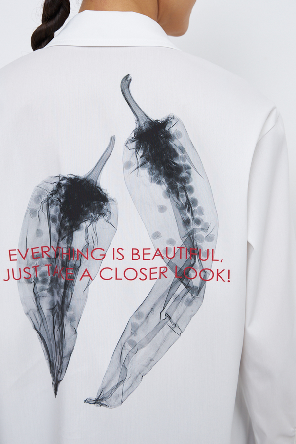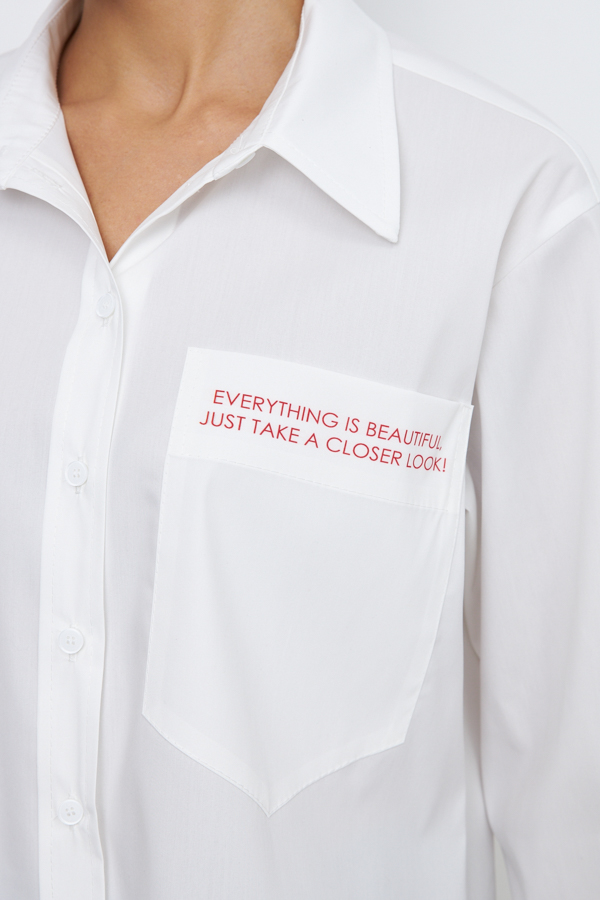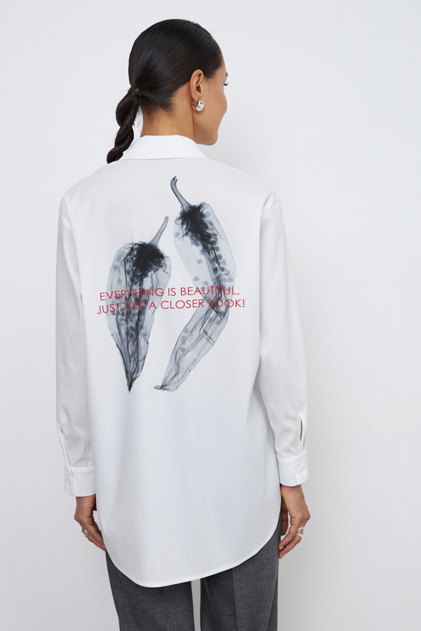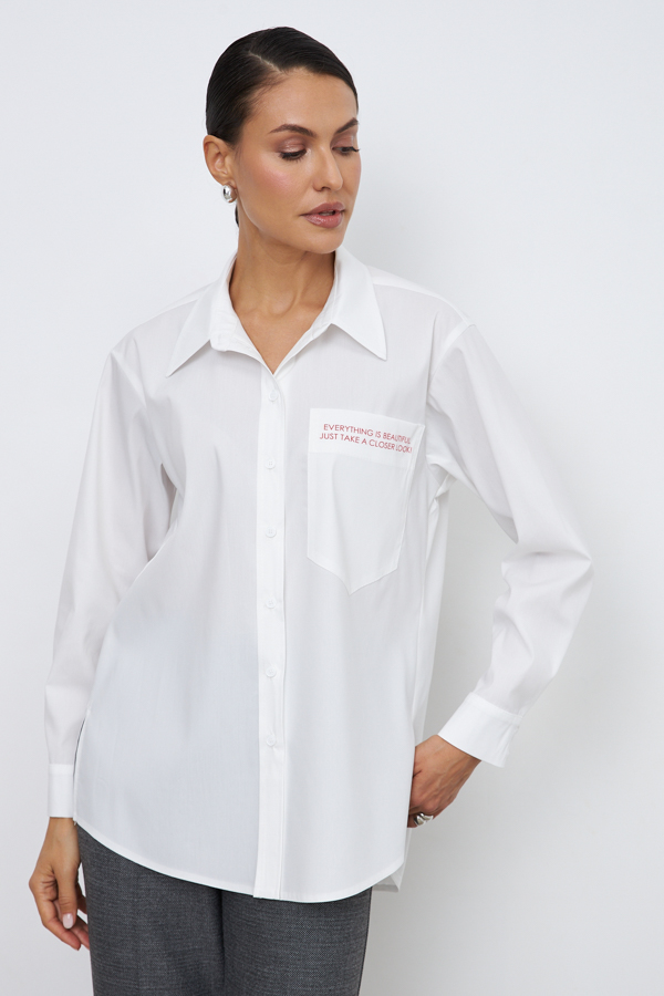 Рубашка свободного силуэта из вискозной ткани с застёжкой на пуговицы. Низ изделия асимметричной длины (спинка удлинена относительно переда) с закруглениями по бокам и разрезами. Рукав рубашечного покроя на манжете с застёжкой на пуговицы. Вырез горловины обработан отложным воротником на стойке. На передней части изделия — накладной карман в области груди. Достоинство этой модели — в её способности скрыть некоторые недостатки фигуры. Её можно сочетать как с брюками, так и с джинсами.