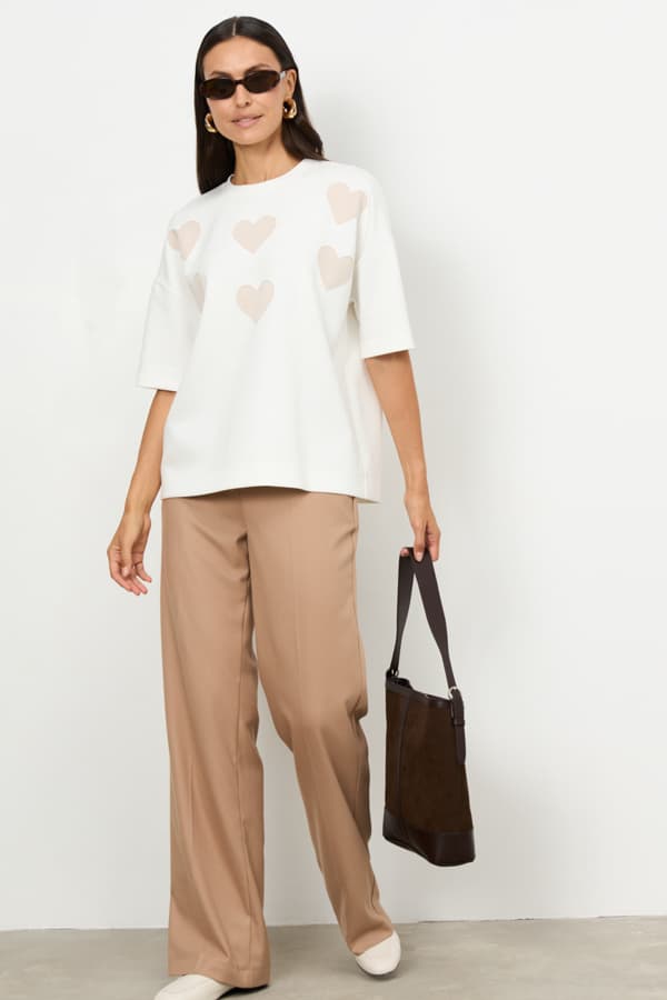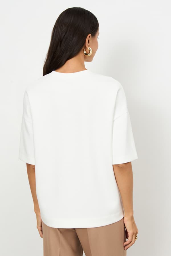 Джемпер из эластичного полотна свободного силуэта. Изделие со спущенной линией плеча и коротким рукавом. Вырез горловины оформлен бейкой из основной ткани. На передней части изделия выполнена аппликация. В таблице размеров представлены параметры человека, а не изделия.