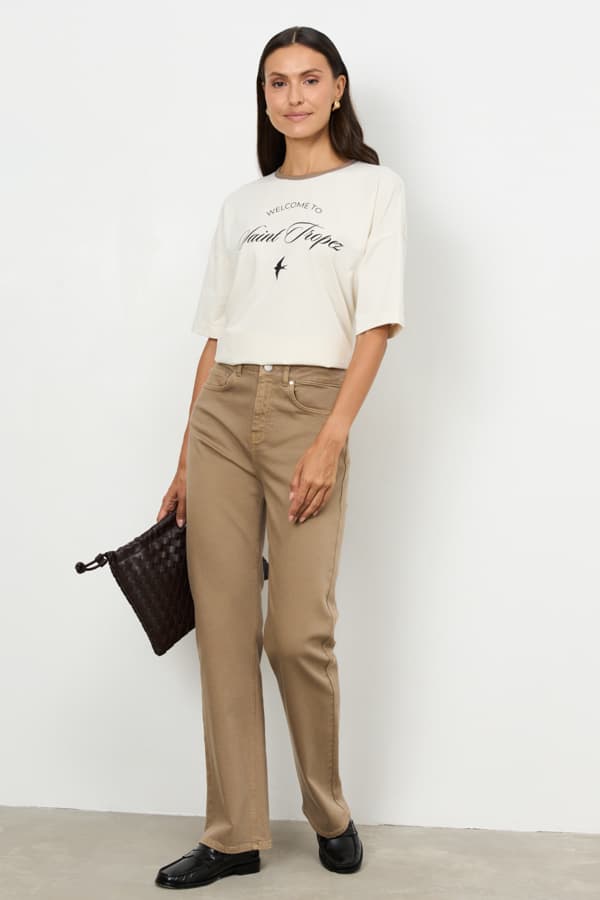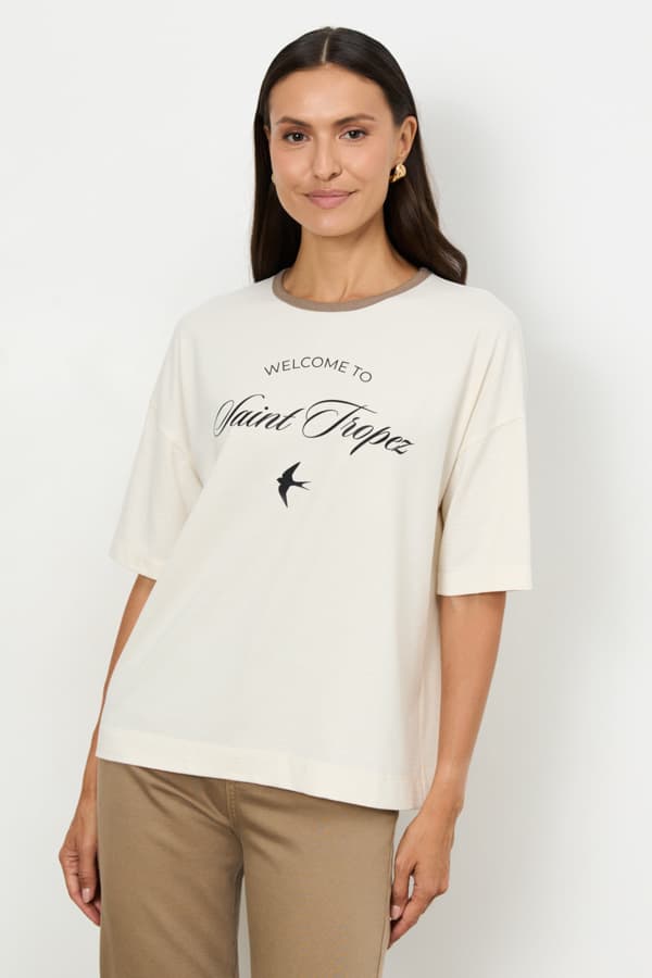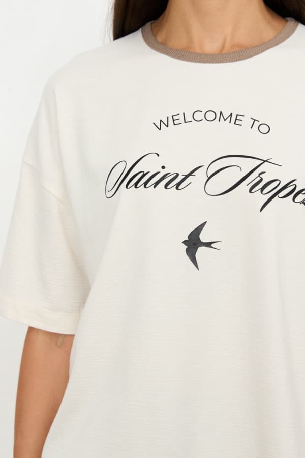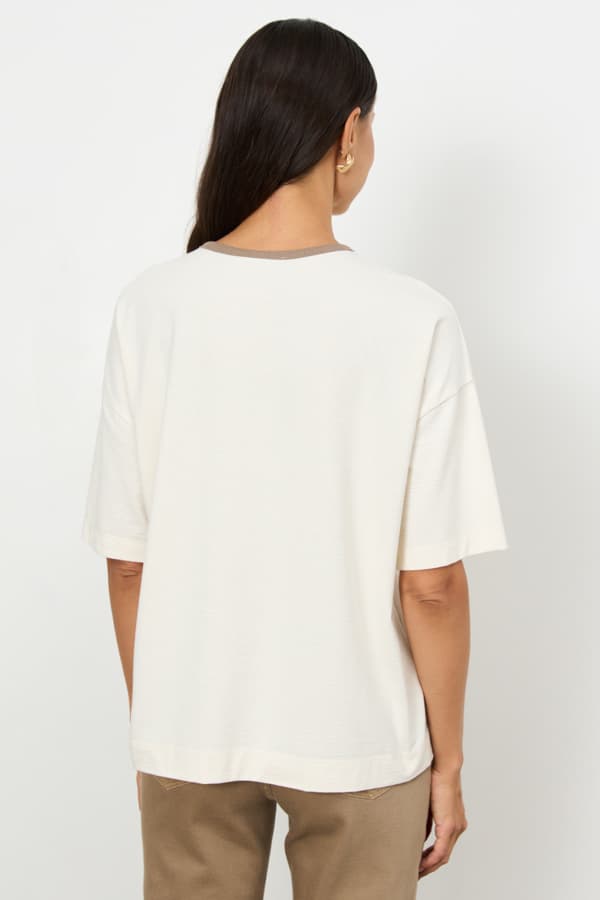 Джемпер из эластичного полотна. Свободный силуэт со спущенной линией плеча и коротким рукавом. Вырез горловины окантован эластичной бейкой. В таблице размеров представлены параметры человека, а не изделия.