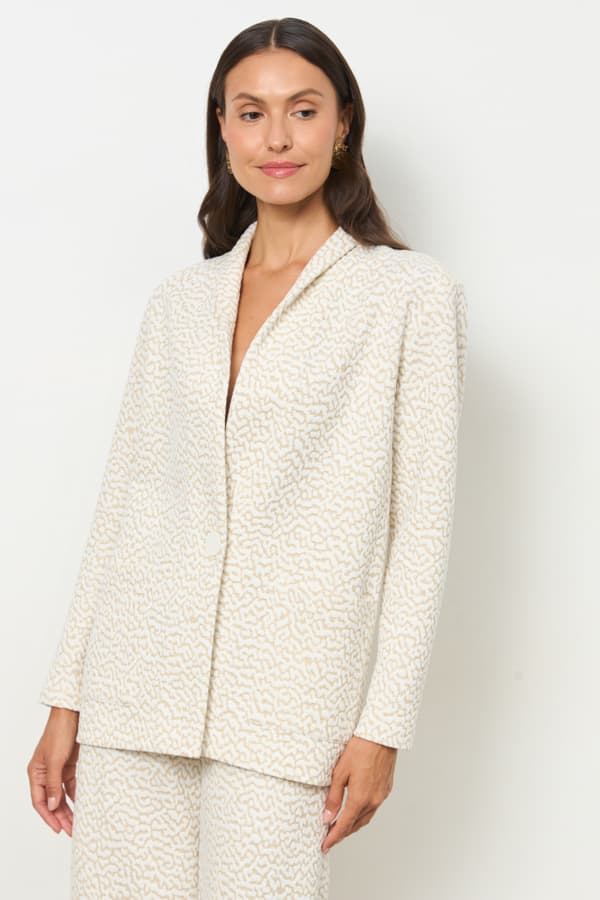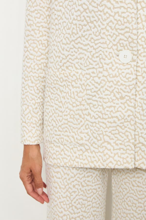 Костюм из эластичного полотна. Брюки прямого силуэта. Пояс с эластичной резиной. Жакет прямого свободного кроя с женственным шалевым воротником. На передней части изделия застежка на пуговицу и накладные карманы. Втачной рукав. Изделие с плечевыми накладками, которые при желании можно убрать.