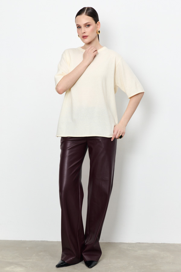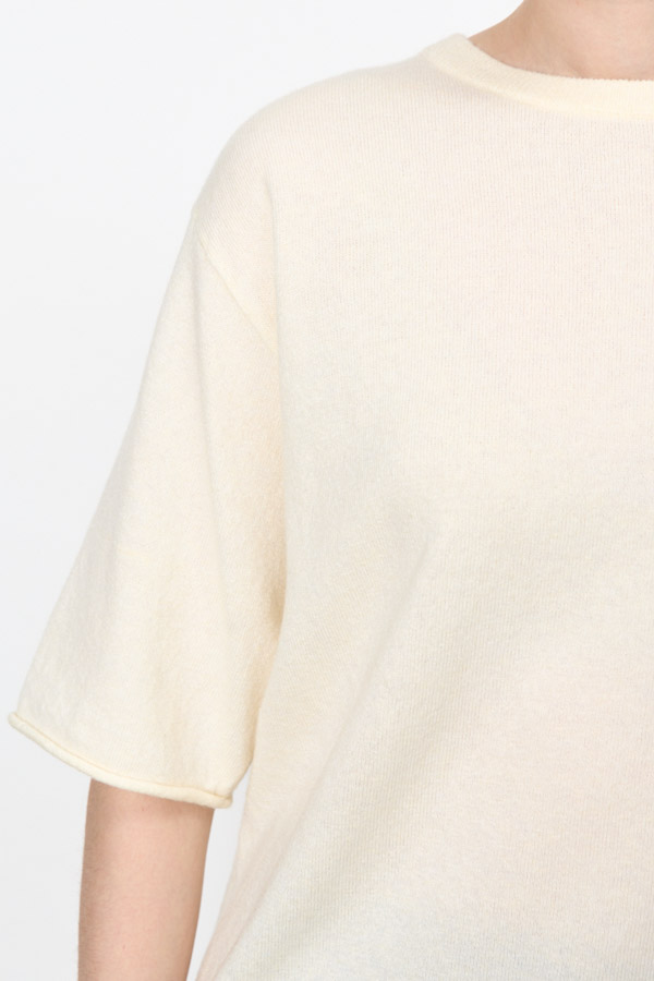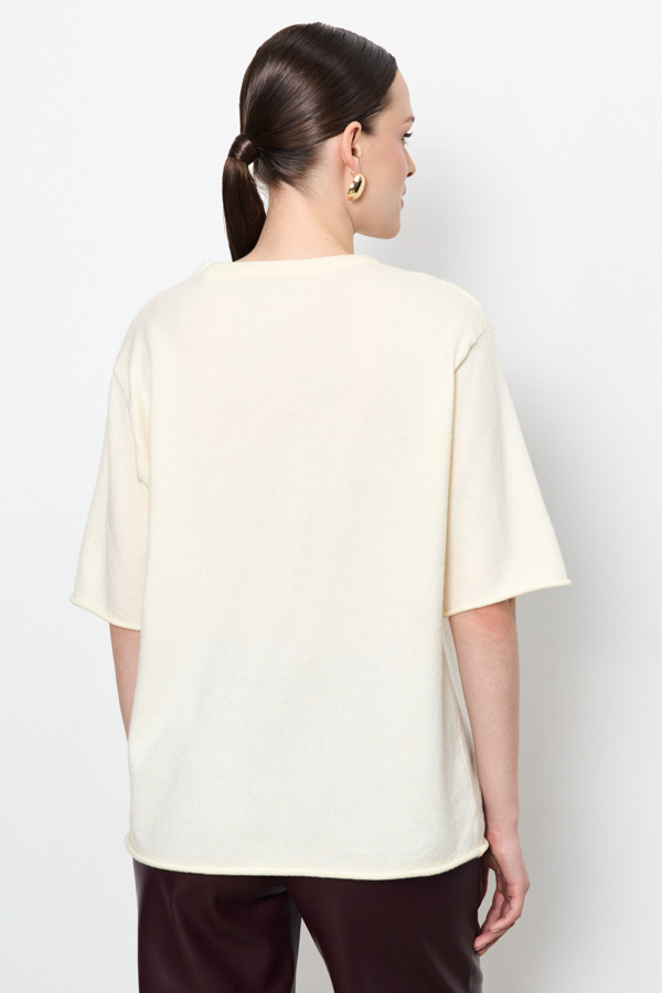 Джемпер свободного силуэта, что обеспечивает комфорт и свободу движений. Рукава короткие, втачные. Низ рукавов и низ джемпера украшен аккуратным руликом, а горловина выполнена в виде мягкой резинки, обеспечивая комфорт и идеальную посадку. Такой джемпер отлично подойдет для повседневного образа и легко сочетается с разными элементами гардероба. Изделие выполнено из мягкой пряжи.