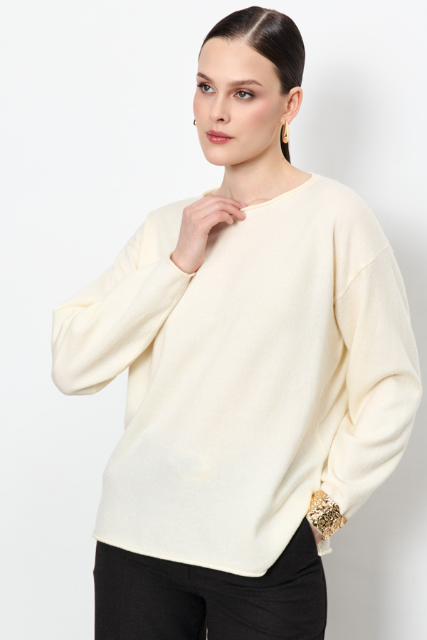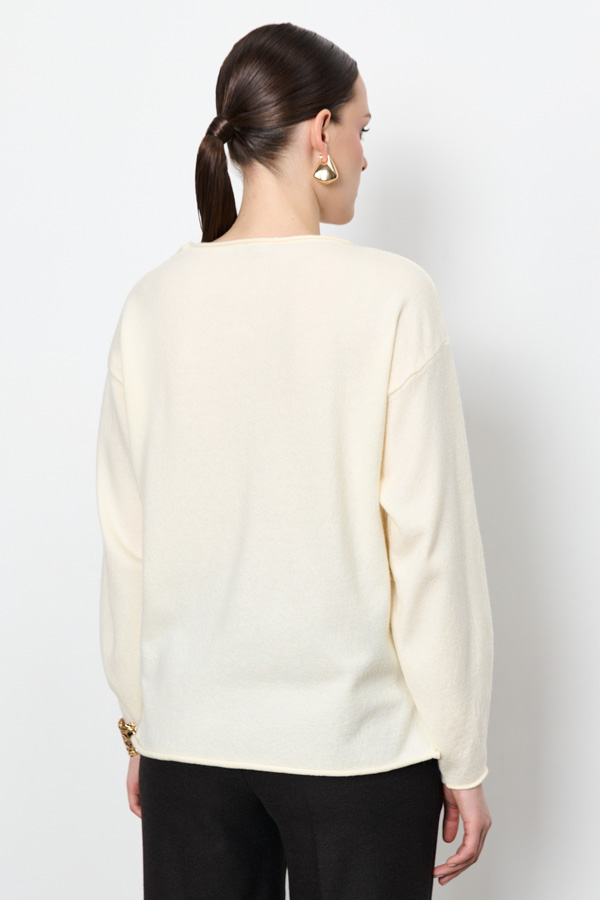 Джемпер свободного силуэта дарит ощущение легкости и свободы движений. По боковому шву предусмотрен аккуратный разрез, который добавляет изделию легкости. Рукава длинные, втачные. Круглый вырез горловины, низ рукавов и низ изделия оформлены аккуратной резинкой с руликом. Изделие выполнено из мягкой пряжи.