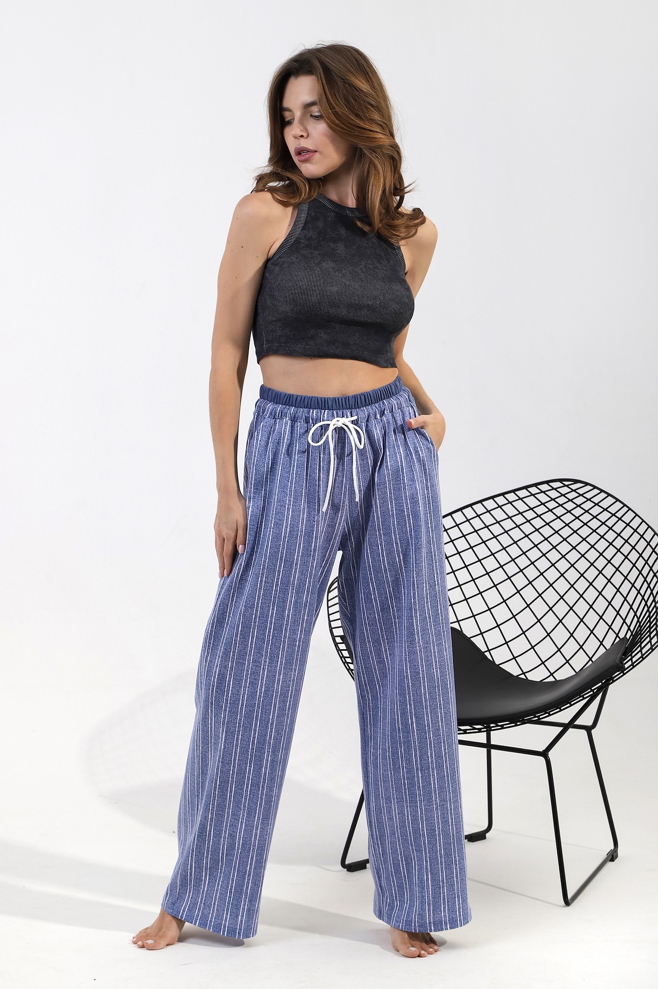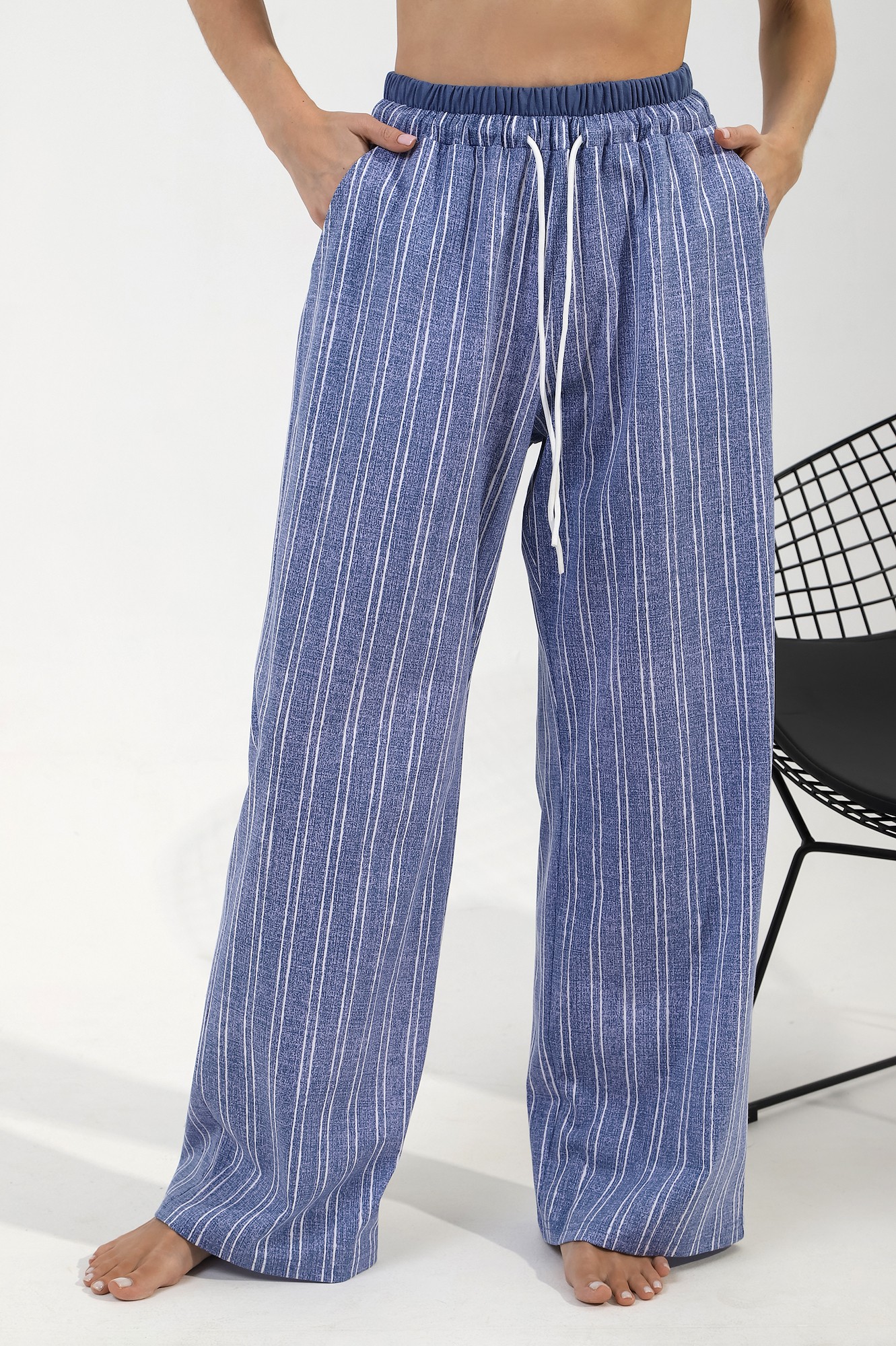 Брюки - молодежные из трикотажного полотна «кулирка» с набивным рисунком «полоска», длинные, свободные, на притачном поясе с эластичной тесьмой внутри, выполненным из двух видов ткани: с набивным рисунком и гладкокрашеной. В пояс вставлен декоративный шнурок, продетый через две обметанные петли в центре пояса.