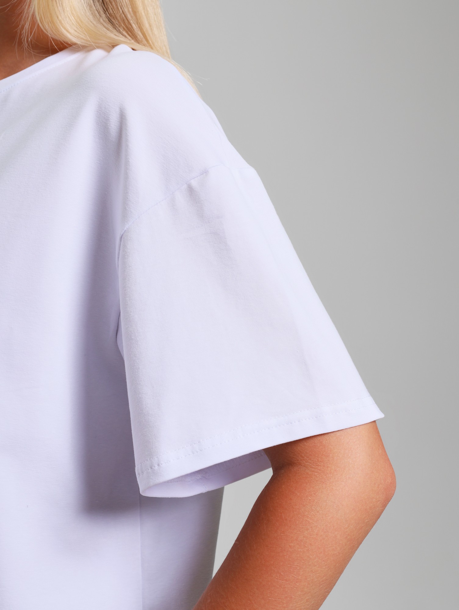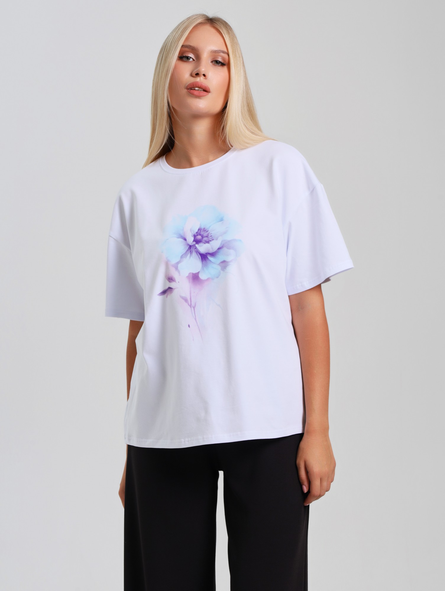 Футболка женская из гладкокрашеного трикотажного полотна «кулирка с лайкрой», классического покроя, с втачными короткими рукавами и печатью на полочке, выполненной в технике «шелкографии». Горловина овальной формы обработана втачной планкой с отделочной строчкой по шву притачивания.