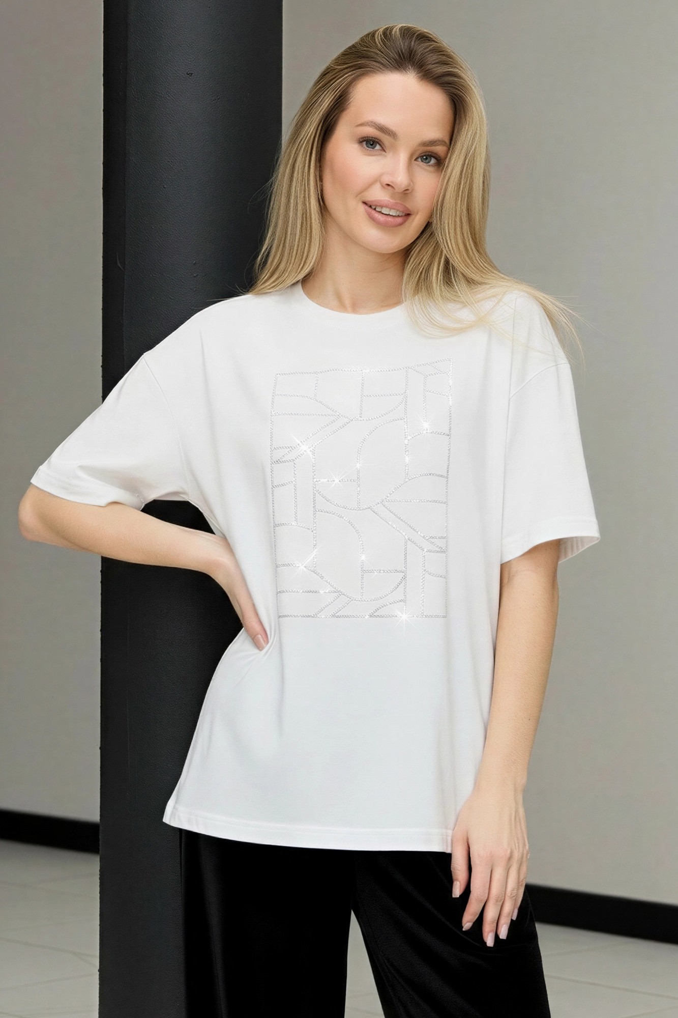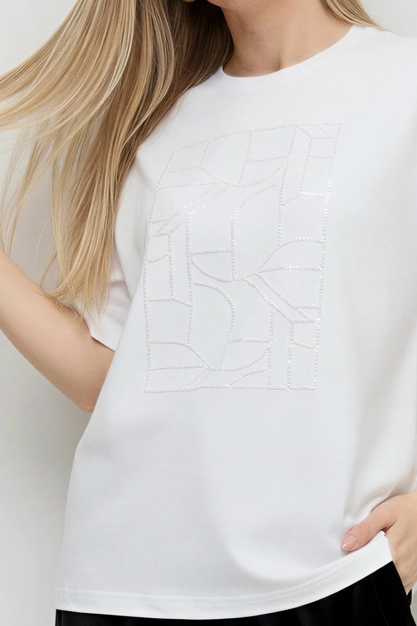 Футболка женская из гладкокрашенного трикотажного полотна «кулирка с лайкрой», свободного покроя, с короткими втачными рукавами, горловиной овальной формы, обработанной втачной планкой. По центру полочки выполнена вышивка «пайетками» в тон изделия.