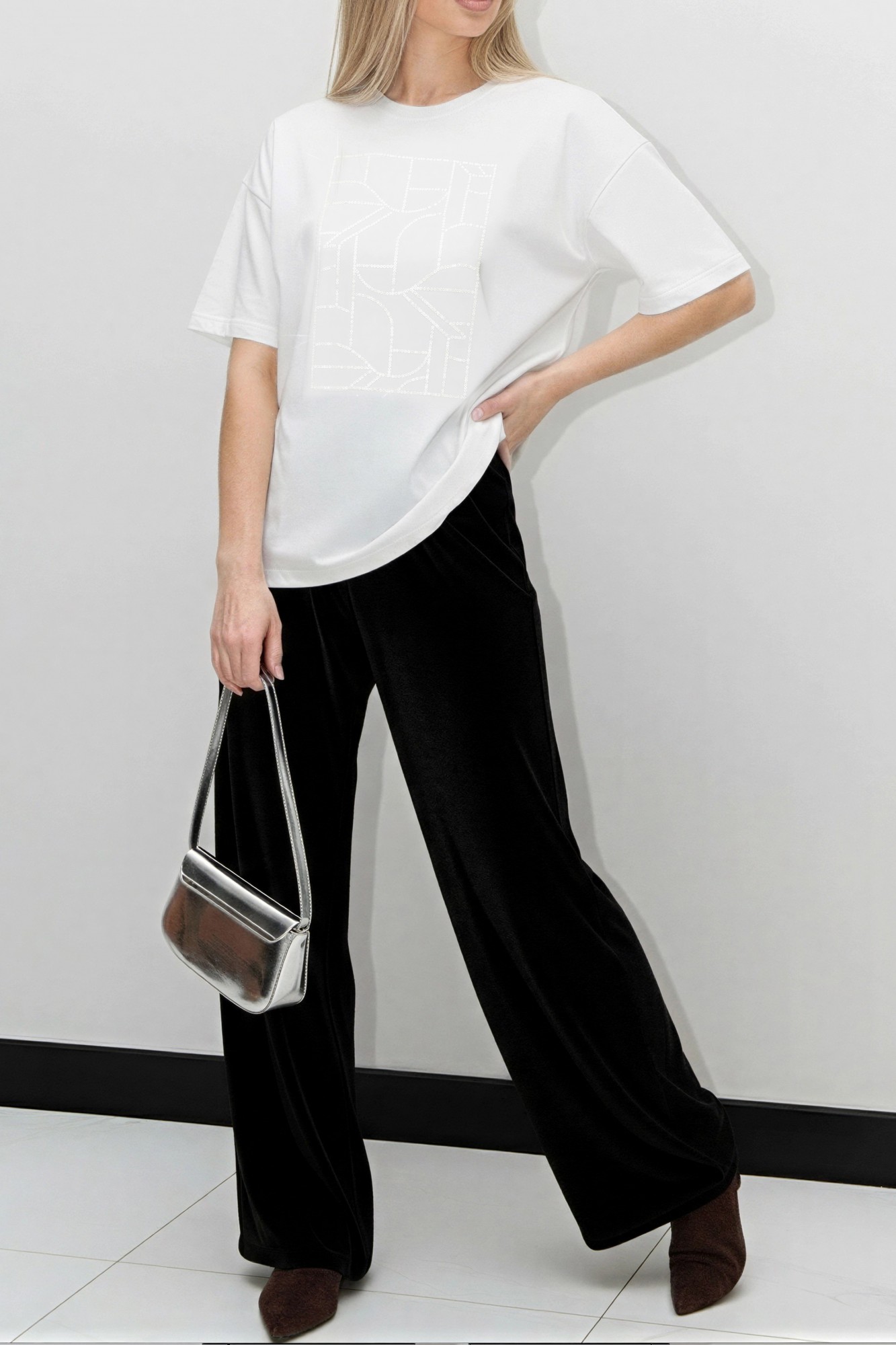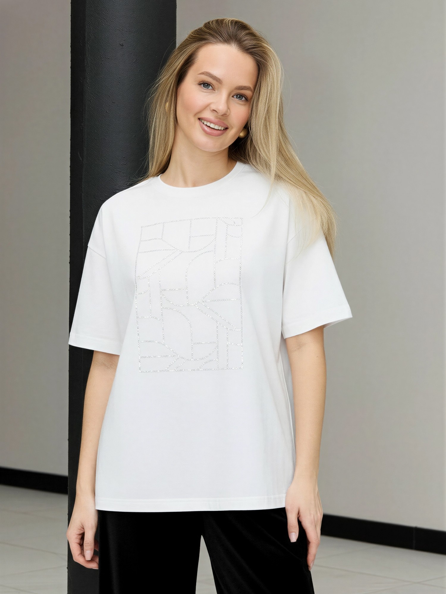 Футболка женская из гладкокрашенного трикотажного полотна «кулирка с лайкрой», свободного покроя, с короткими втачными рукавами, горловиной овальной формы, обработанной втачной планкой. По центру полочки выполнена вышивка «пайетками» в тон изделия.