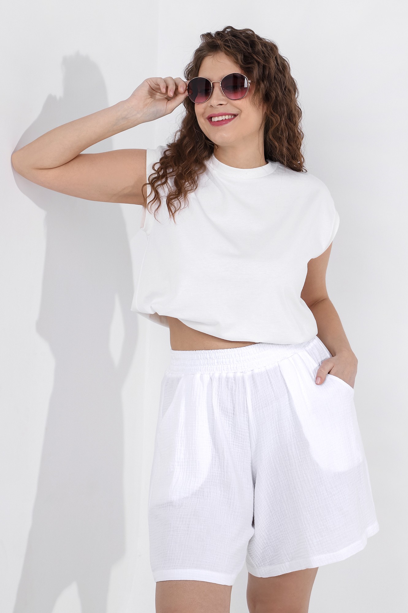 Шорты женские из тканого полотна «муслин» с набивным рисунком, свободные, с карманами в боковых швах, на притачном поясе с эластичной тесьмой внутри.