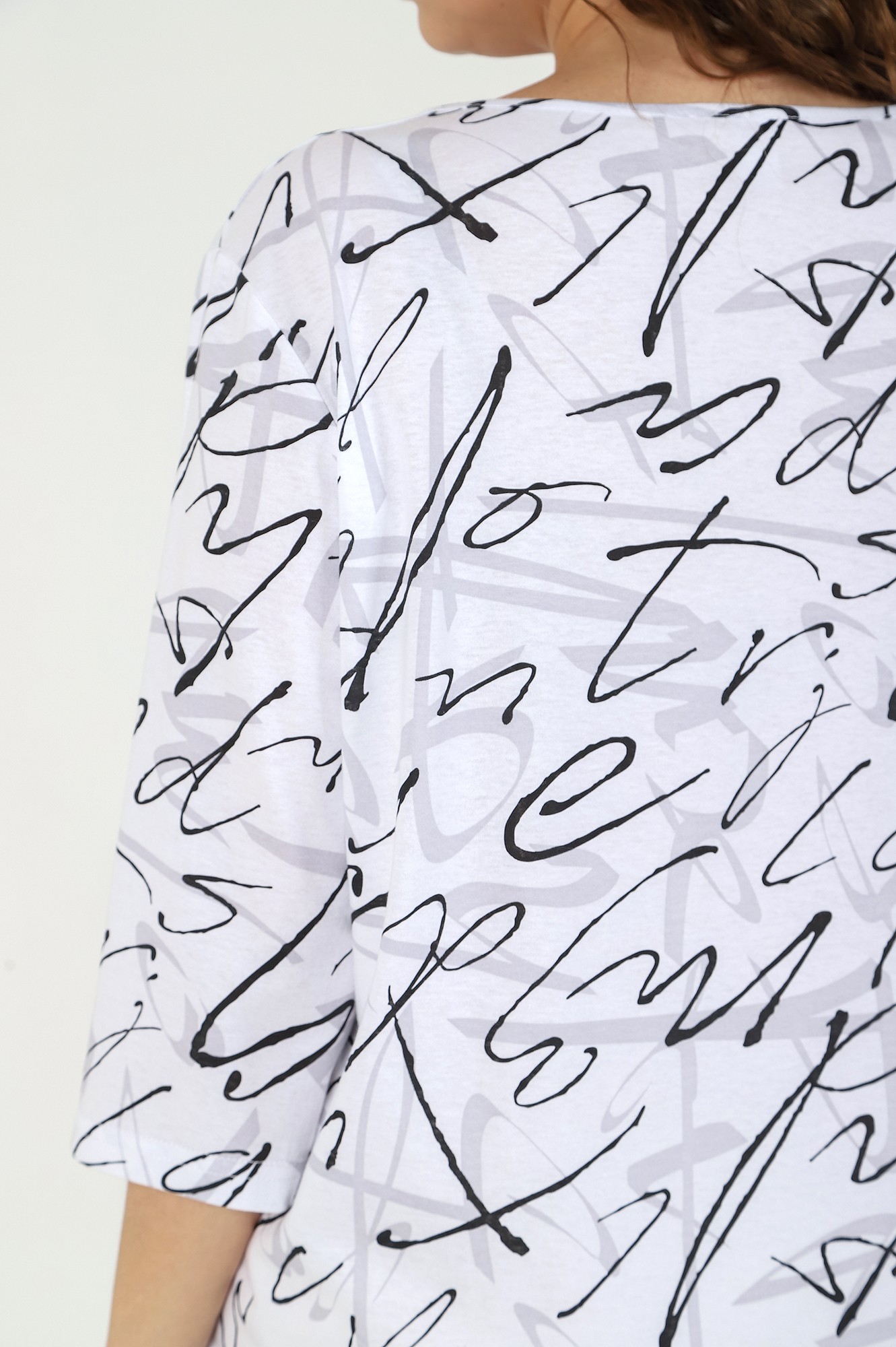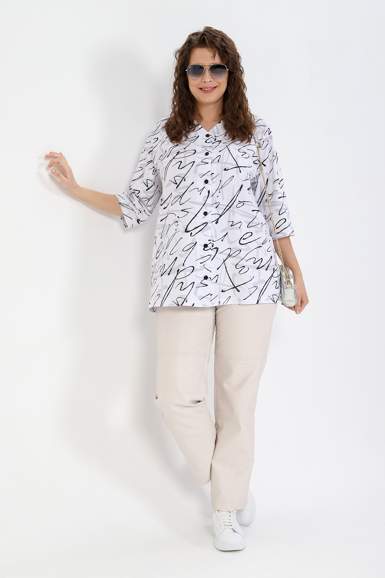 Блуза женская свободного покроя, из трикотажного полотна «кулирка», с рукавами ¾ длины, центральной бортовой застежкой на петли и пуговицы. V-образная горловина переда обработана обтачками, спинки – окантована.