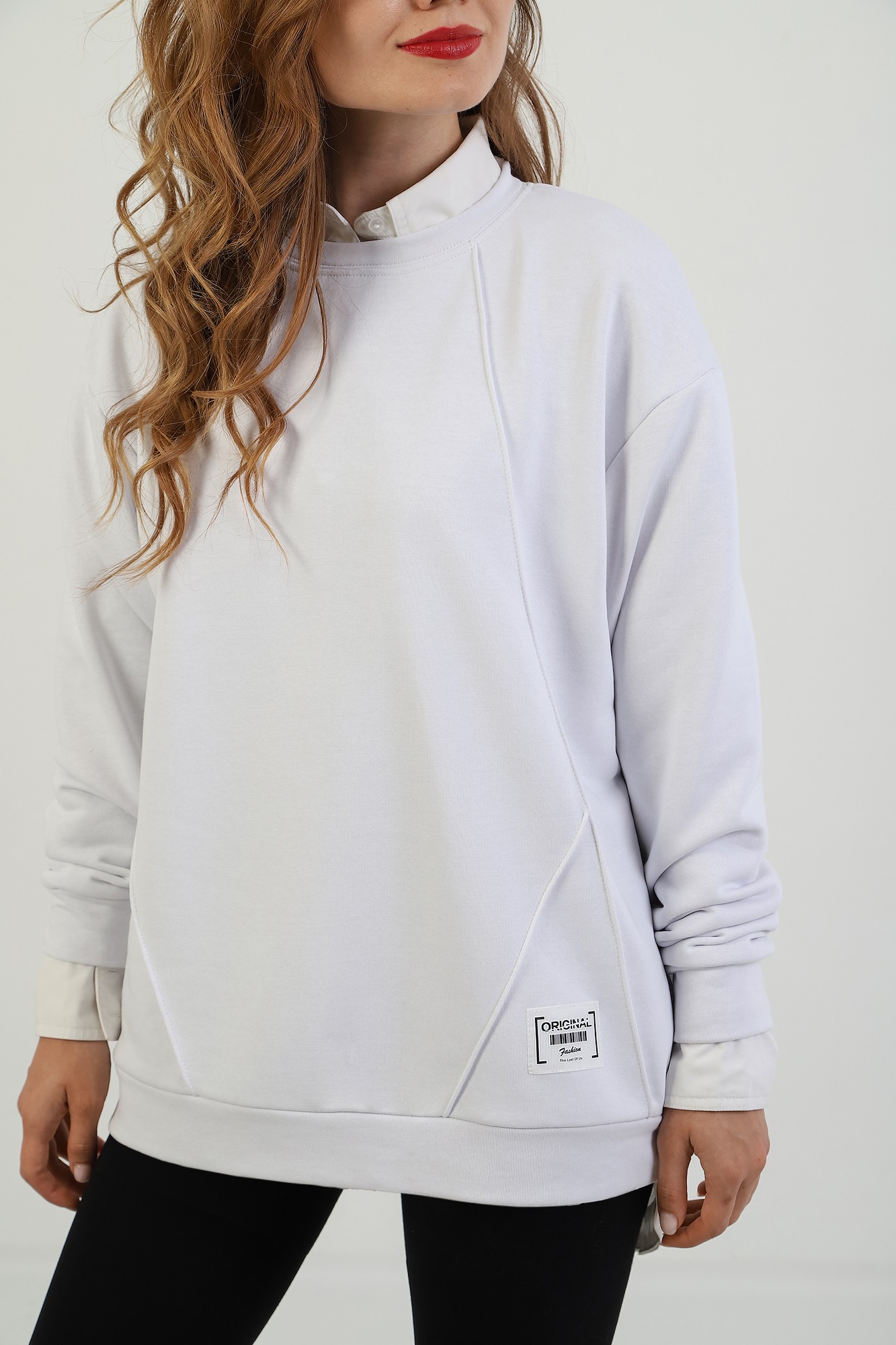 Джемпер молодежный из трикотажного полотна «футер» трехнитка-петля со спущенным плечом, длинными рукавами и горловиной овальной формы, обработанной втачной планкой. На полочке выполнены четыре ассиметричные отделочные строчки. Рукава – с манжетами, низ изделия на притачном поясе, с левой стороны настрочен декоративный элемент.