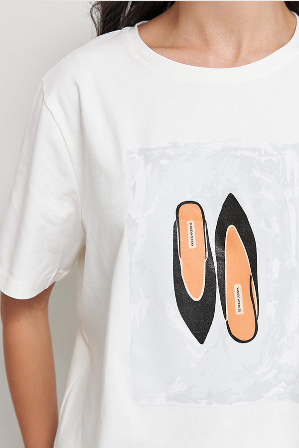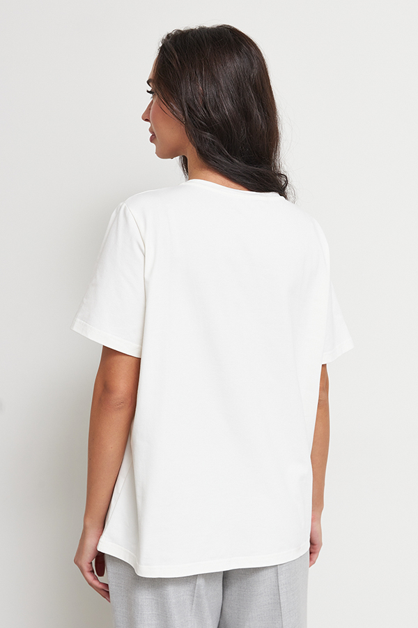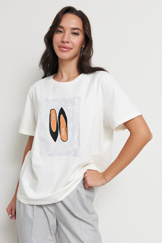 Джемпер свободного силуэта из хлопкового эластичного полотна. Втачной короткий рукав. Круглый вырез горловины оформлен бейкой. На передней части изделия нанесён принт методом шелкографии.