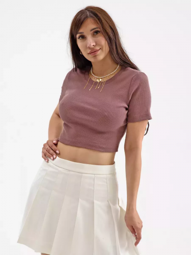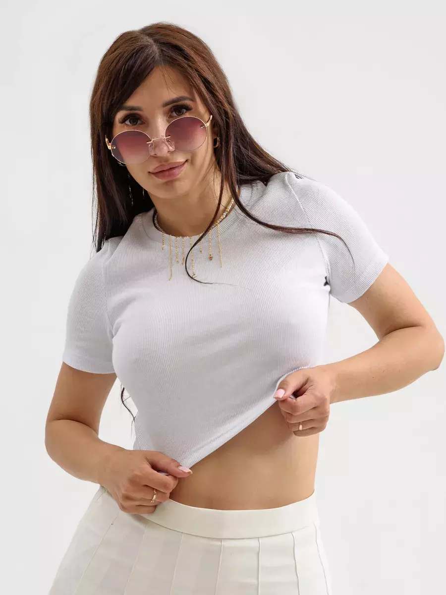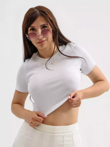 Футболка укороченная женская спортивного стиля, прилегающего силуэта- тренд сезона, выполнена из трикотажного х/б полотна с выработкой «рубчик» . Круглая горловина обработана бейкой из основного материала. Короткий втачной рукав.