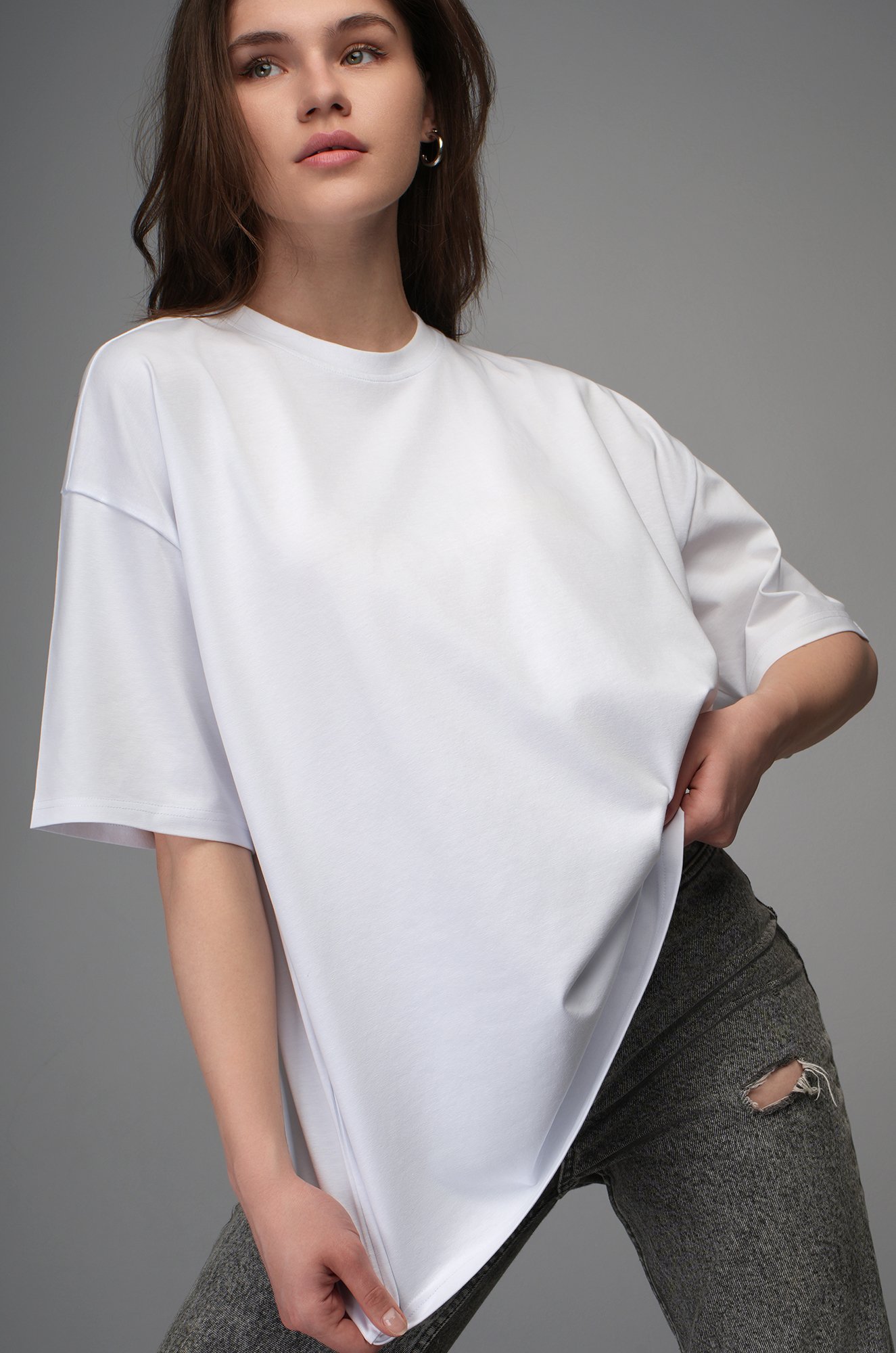 Женская футболка оверсайз выполнена из трикотажа с высоким содержанием хлопка. Белая футболка легко сочетается с любым низом.
