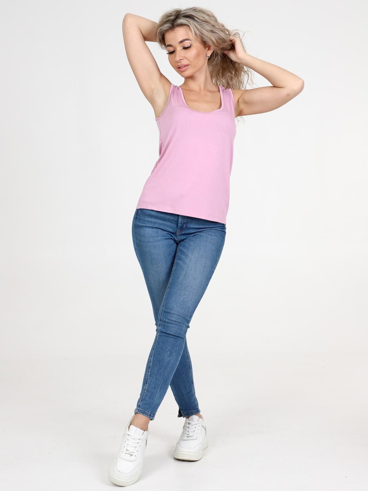 Женская майка выполнена из трикотажного полотна "вискоза". Майка полу прилегающего силуэта, с глубоким вырезом и широкими лямками. Горловина майки и проймы обработаны бейкой.