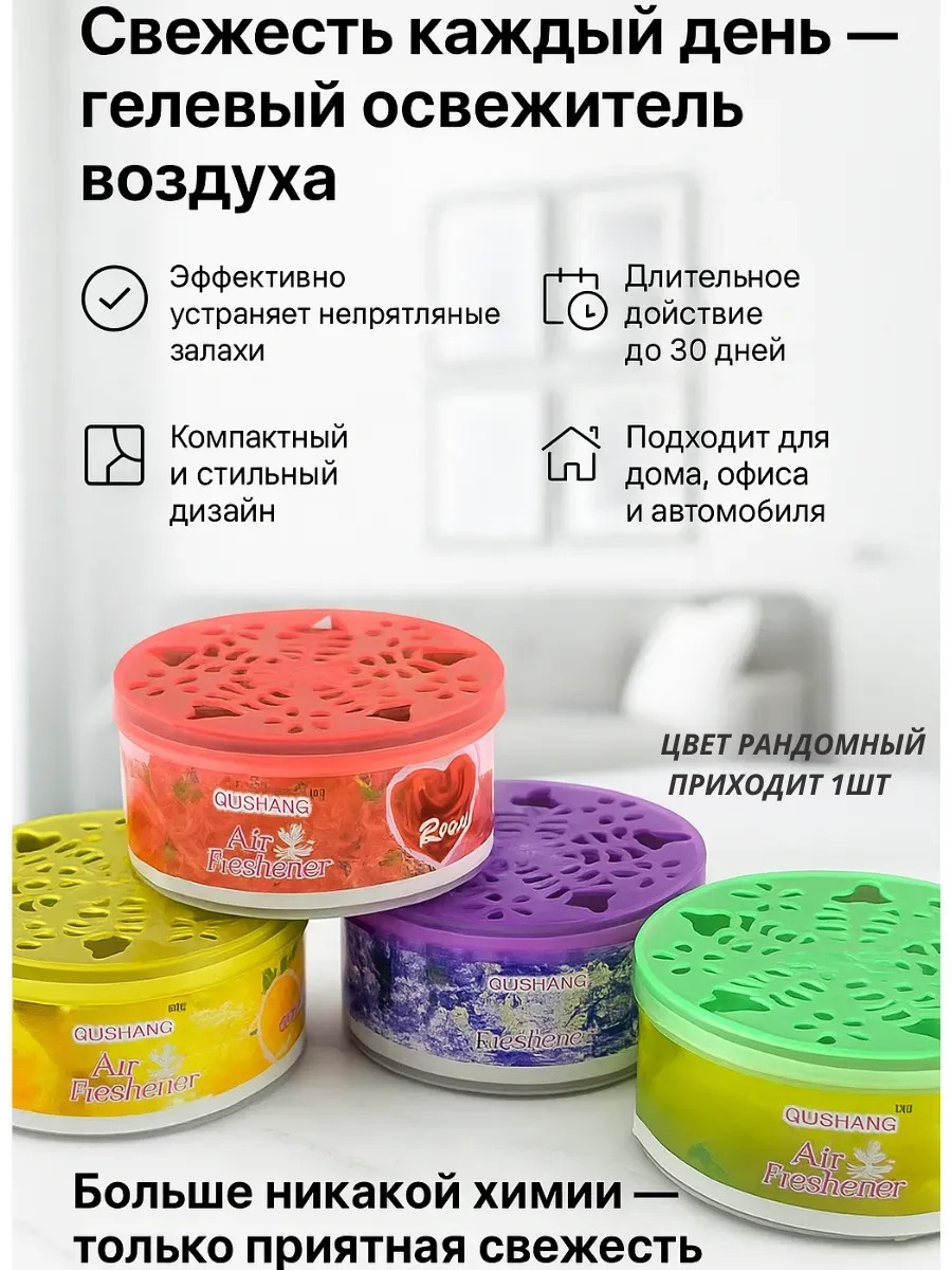 Инновационный гелевый освежитель воздуха обеспечивает постоянное и равномерное ароматизирование помещений без необходимости распыления. Компактный диск весом 63 г разработан для эффективной нейтрализации неприятных запахов и создания приятной атмосферы в небольших закрытых пространствах. Гель постепенно испаряется при контакте с воздухом, высвобождая ароматические молекулы и нейтрализуя неприятные запахи. Интенсивность аромата можно регулировать достаточно закрыть крышку. Области применения: Туалет и ванная комната Гардеробные и шкафы для одежды Салоны автомобилей Кухонные шкафы и холодильники Кладовые и подсобные помещения Почему выбирают наш освежитель: Не требует электричества или батареек Не оставляет пятен на поверхностях Можно использовать как в вертикальном, так и в горизонтальном положении Герметичная упаковка сохраняет свойства до вскрытия Не вызывает головной боли как сильные аэрозоли Забудьте о неприятных запахах! Закажите гелевый освежитель воздуха и наслаждайтесь свежестью до 45 дней.