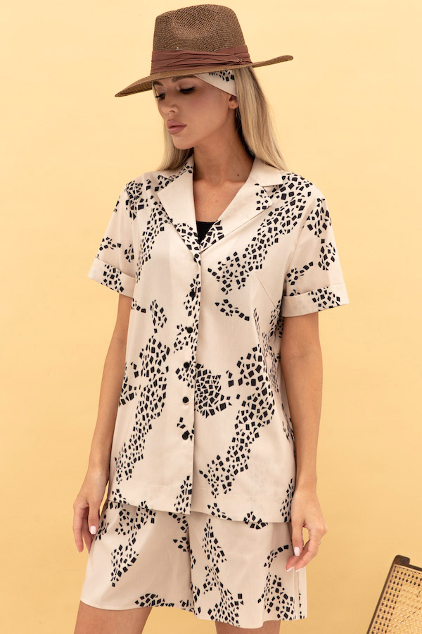 Блуза свободного силуэта с застёжкой на пуговицы из вискозной ткани. Втачной короткий рукав с отворотом. Вырез горловины оформлен английским воротником, который визуально сделает фигуру стройнее и подчеркнет красивую линию груди. В комплекте пояс из основной ткани.