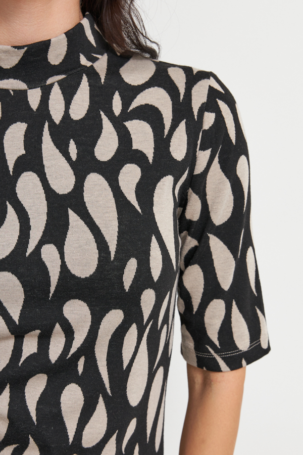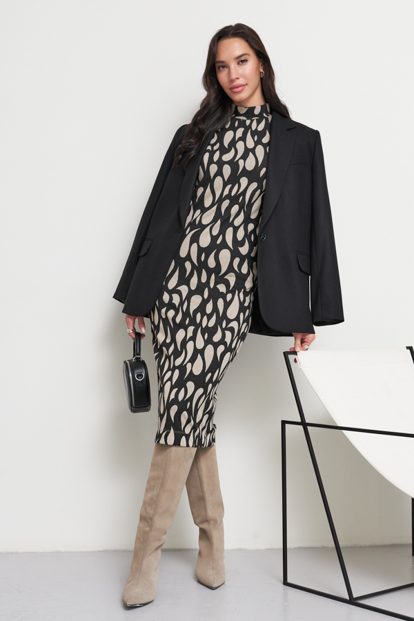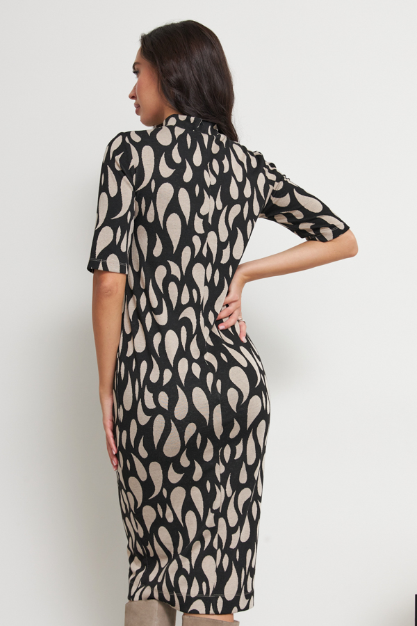 Платье полуприлегающего силуэта из эластичного полотна с жаккардовым узором. Вырез горловины оформлен воротником-стойкой. Рукав втачной.