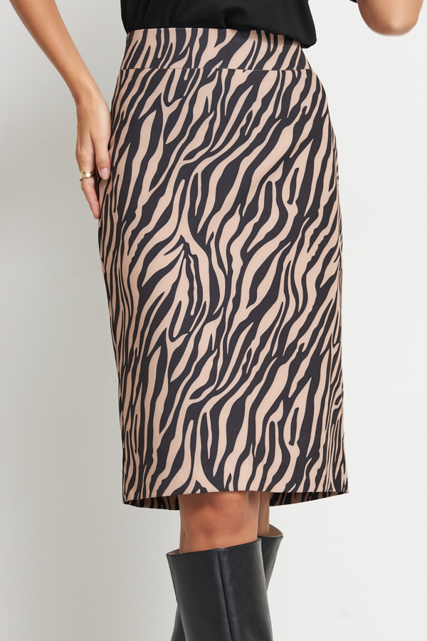 Юбка прилегающего силуэта из эластичной, костюмной ткани. Сзади по среднему шву застёжка-молния, снизу разрез. Пояс притачной.