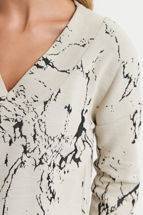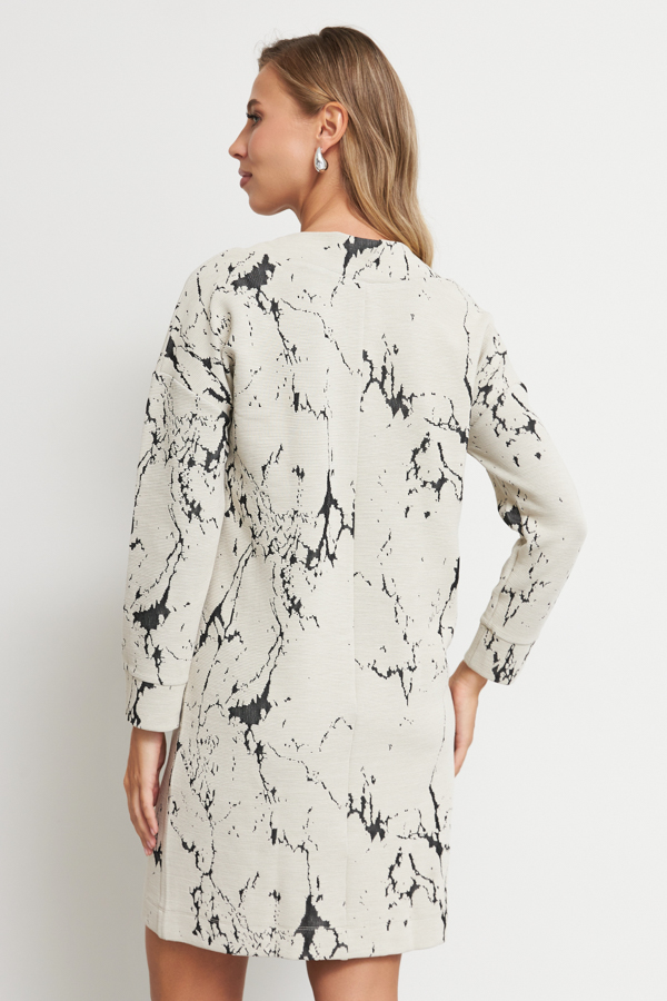 Платье свободного силуэта из фактурного эластичного полотна. V-образный вырез горловины обработан притачной планкой. Втачной длинный рукав в спущенную пройму с манжетой.